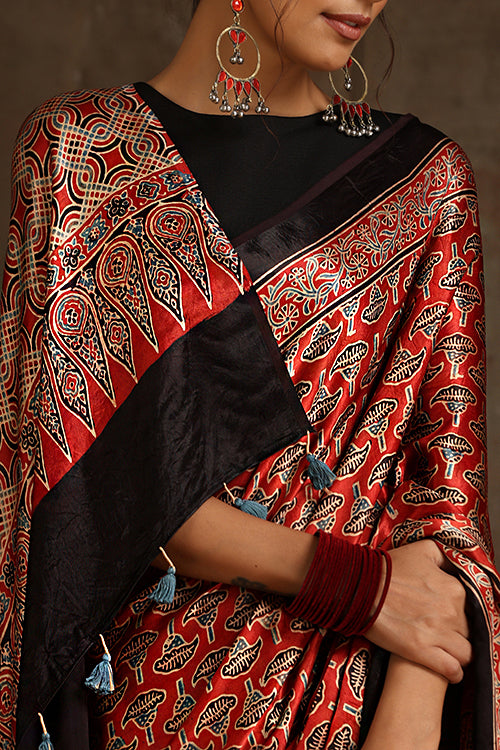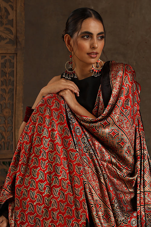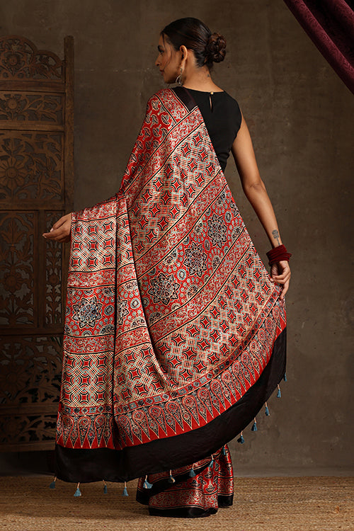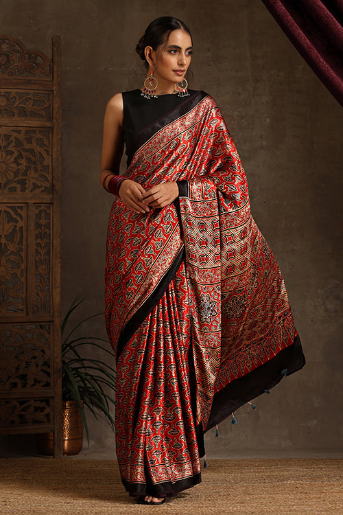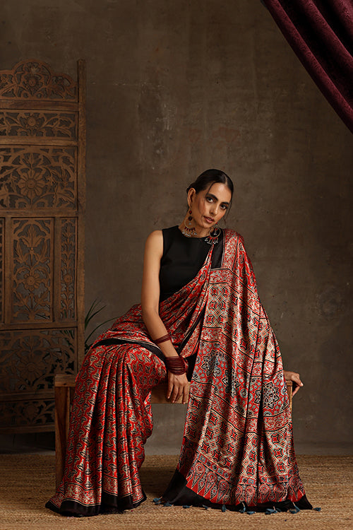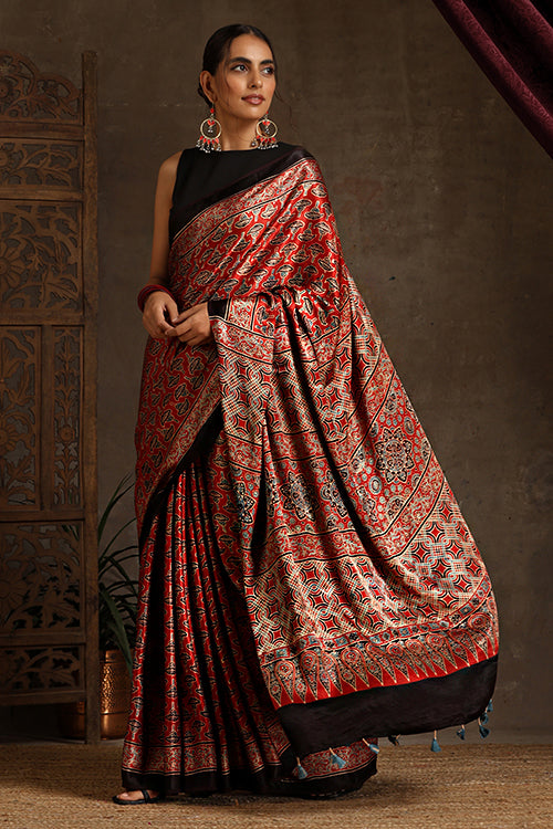 Tenaaro Ajrakh Hand Block Printed Modal Satin Saree