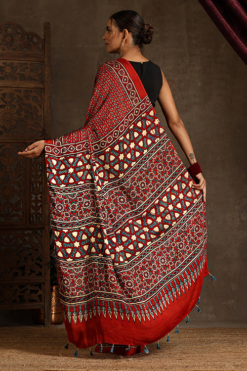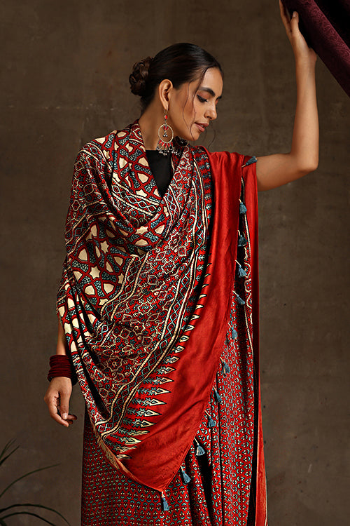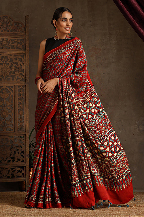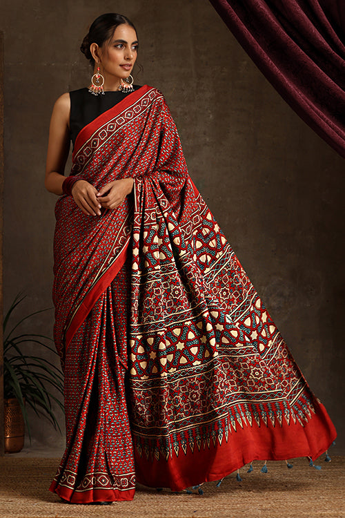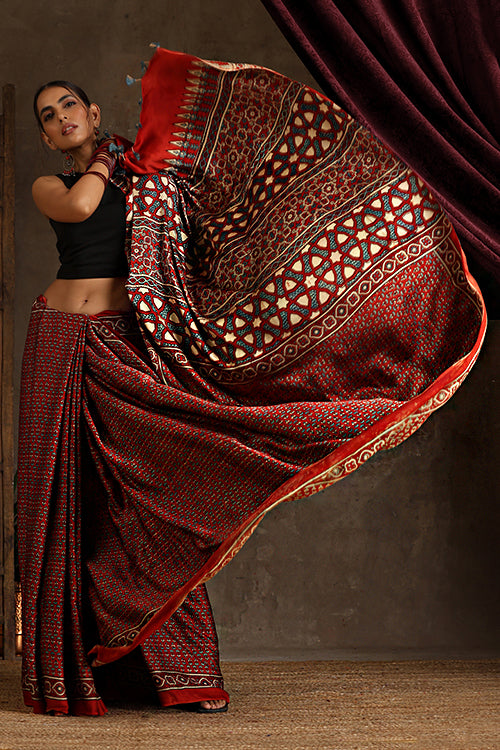 Tenaaro Ajrakh Hand Block Printed Modal Satin Saree