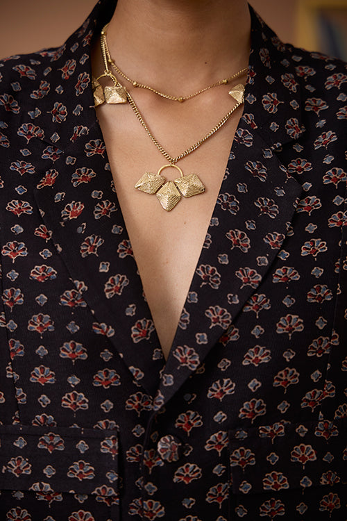 For the women of the new era, repurposed tales of Ajrakh Handblock Printing in modern silhouettes- we bring to you our "Black Agate" Printed Blazer. Handmade from pure Chanderi Silk, the stunning black fabric has intricate motifs all over it. Crafted with minute attention to details, the front of the Blazer has one fabric metal button and 2 patch pockets at the flaps. Shoulder pads with 2-layered felt and fusing in the lapel provide structure seamlessly to the flowy fabric. Wear over a tank top and beige pants and add on some statement jewelry- rock the festivities with your charisma!