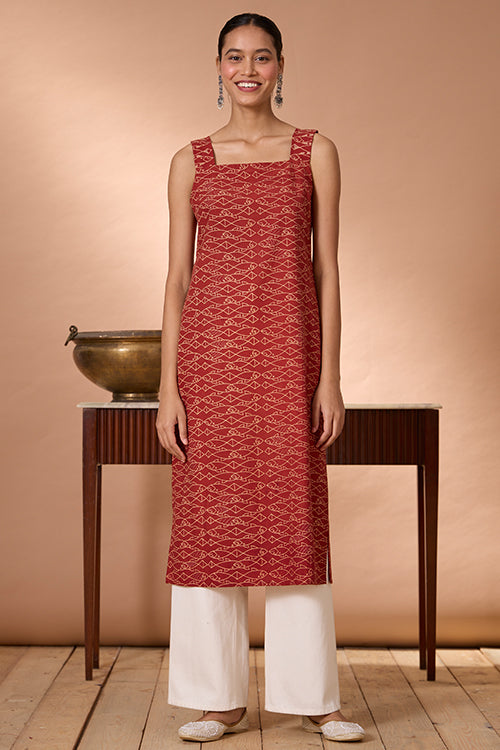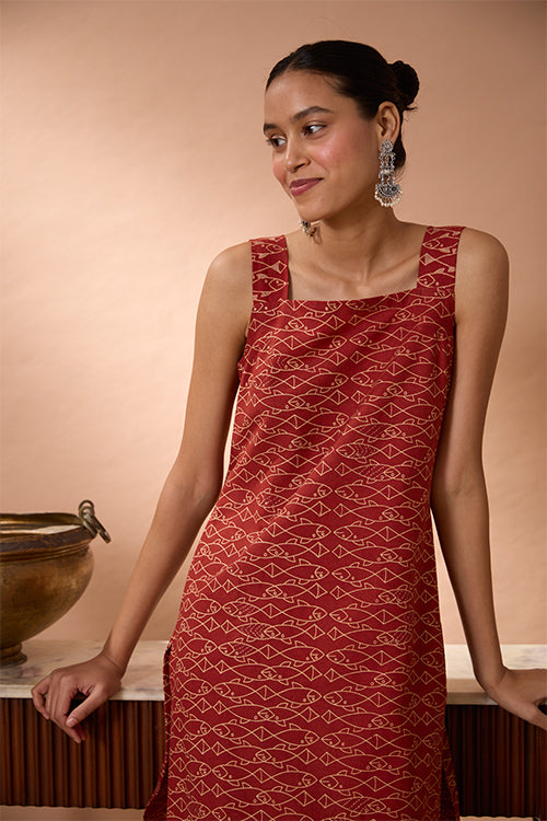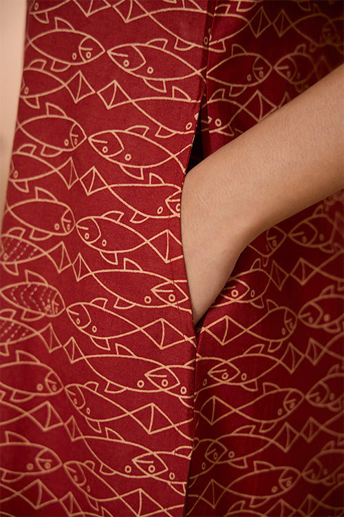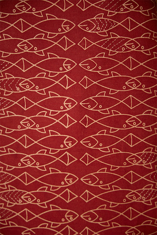 Get closer to the elements of nature as you put on our “Pisces Love” Kurta, with numerous hand-block printed fishes swimming across the vibrant red canvas! Crafted from pure cotton with love, the dress gives you the utmost comfort and that too fashionably. Our artisans have patiently embroidered on the straps and running stitches enrich the simplicity on the front part. Go about your day carefree as you store your utilities in the 2 pockets provided on the sides. A kurta for college, office wear, or for an evening outing- our hassle-free “Pisces Love” is sure to lift your mood every time you put it on!