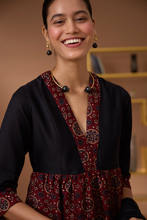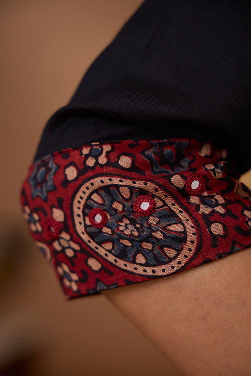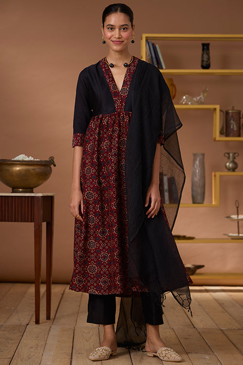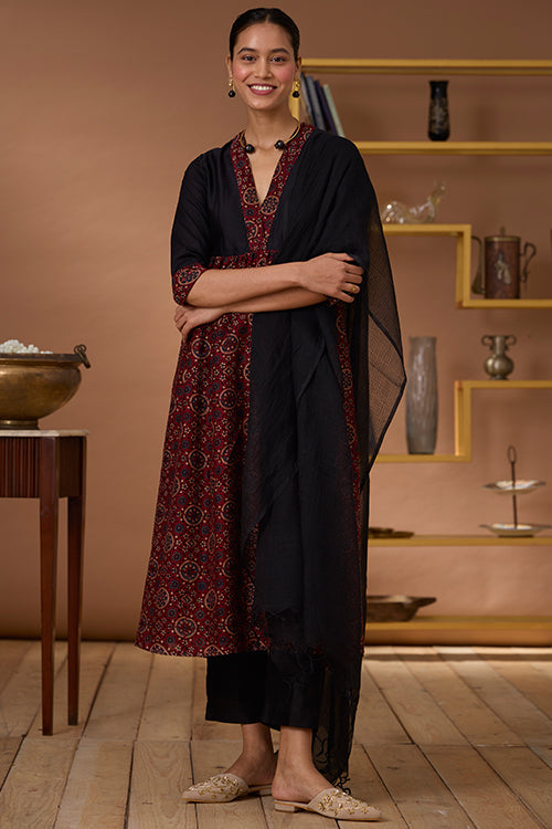 Introducing our "Amber Flames" Ajrakh Printed Kurta Pant Set, to welcome the festive season. Crafted from exquisite pure Chanderi Silk, the flared maroon-red part of the kurta has mesmerizing patterns handblocked onto it. With a flattering V-neckline on the black yoke, the kurta comes lined with Mul fabric (excluding the sleeves) for your comfort and has mirrors embroidered on the centre line of sleeves cuffs at intervals. A concealed zipper on the side and 2 pockets on the sides complete the kurta. Put on the pair of black pants in the set, which comes elasticated at the back and with a zipper for closure. The heavenly black Kota Doria Dupatta seals the deal and makes you feel absolutely ethereal!