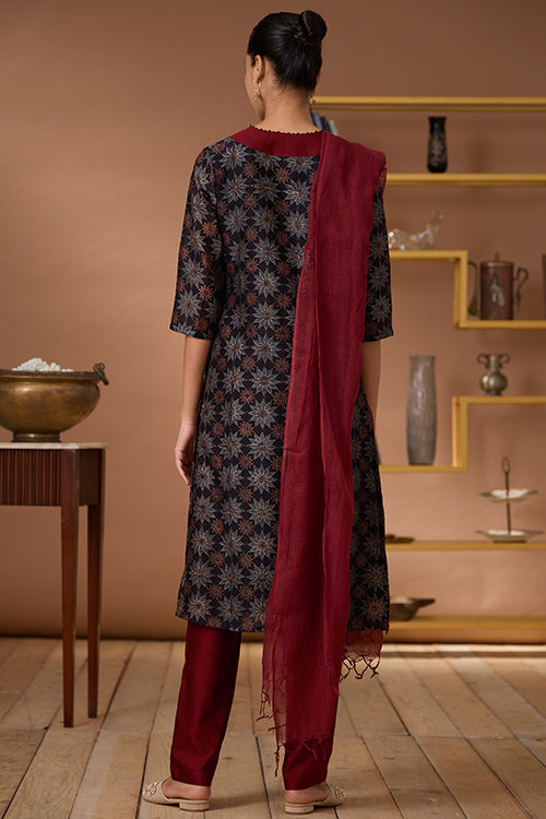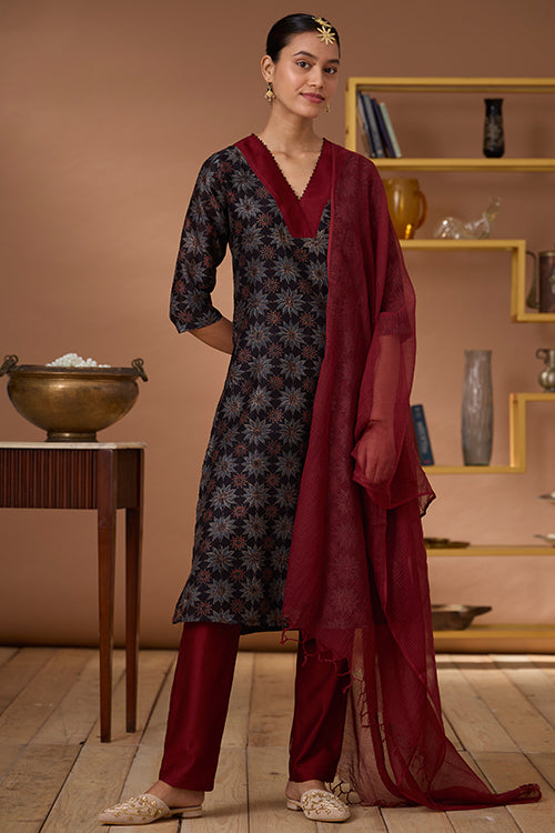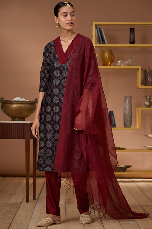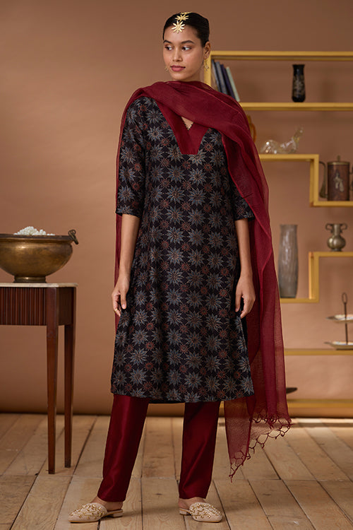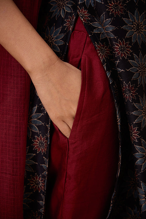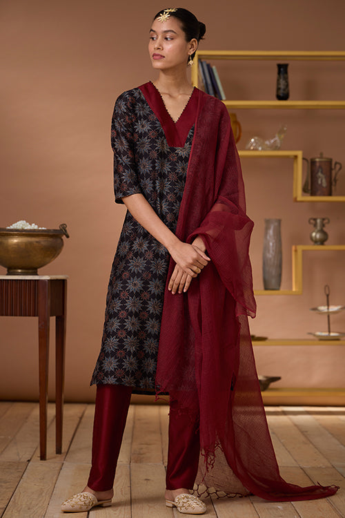 Ethereal and comfort galore, we bring to you this festive season the blooming "Carnelian" Chanderi Silk Kurta. The bodice of black Chanderi Silk fabric showcases majestic floral motifs achieved through the traditional art of Ajrakh printing. The Maroon red collar border catches the eye with its intricate running stitches and black beads stitched along the front and back neck round. Sublime to the eyes and soothing to the skin, the kurta comes lined with pure cotton Mul beneath (excluding the sleeves). The complimentary Maroon red pants come with press buttons for closure and are elasticated at the back. Store away your essentials in the 2 pockets provided in the pants. To add that extra oomph, wrap the red Kota Doria Dupatta. No need to wait anymore and celebrate yourself wearing "Carnelian"!