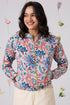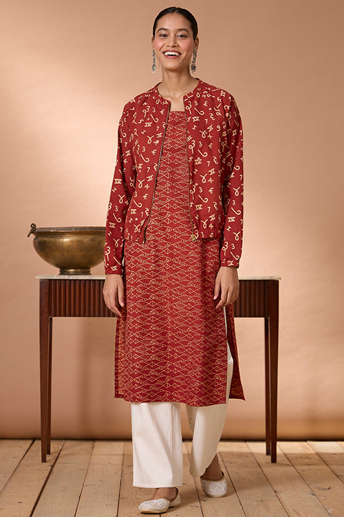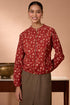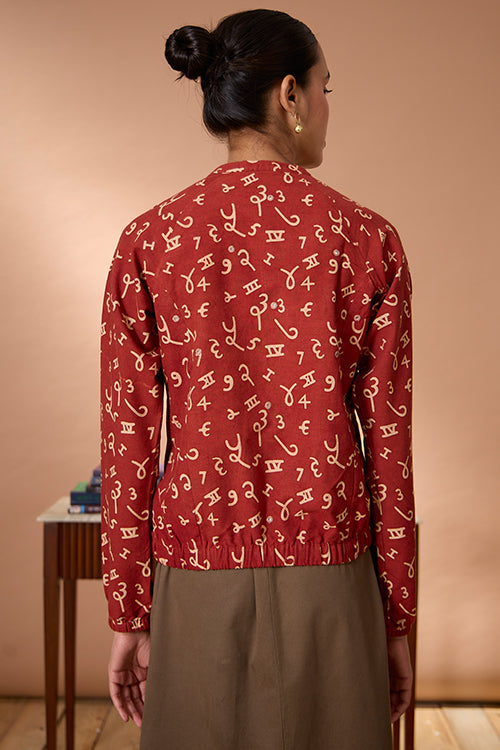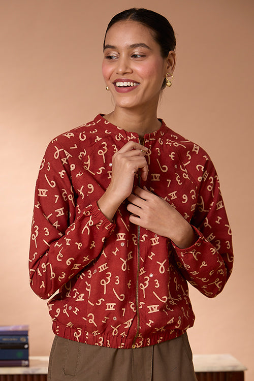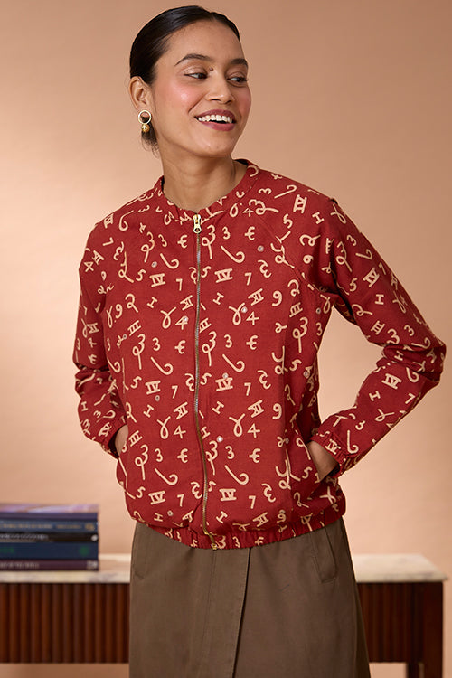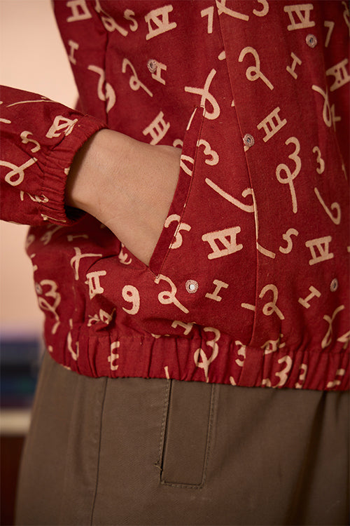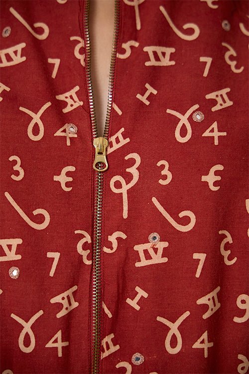 Creativity and artisanal dedication come together in the shape of this red Bomber Jacket, for the woman on the go. Handcrafted from pure cotton fabric, it showcases an array of numbers in different languages block printed onto the vibrant red canvas. Hand-embroidered mirrors adorn the fabric in both the front and back parts, catching the light and attention. Fusing in functionality, the jacket is double-layered at the front and back yoke and comes with 2 pockets. The edge of the sleeves and waist are elasticated, making sure it is all snug and fitted. Pair it with your go-to pair of jeans, and sneakers, and for fun, locate away numbers in the languages you know on “Crimson Count”!