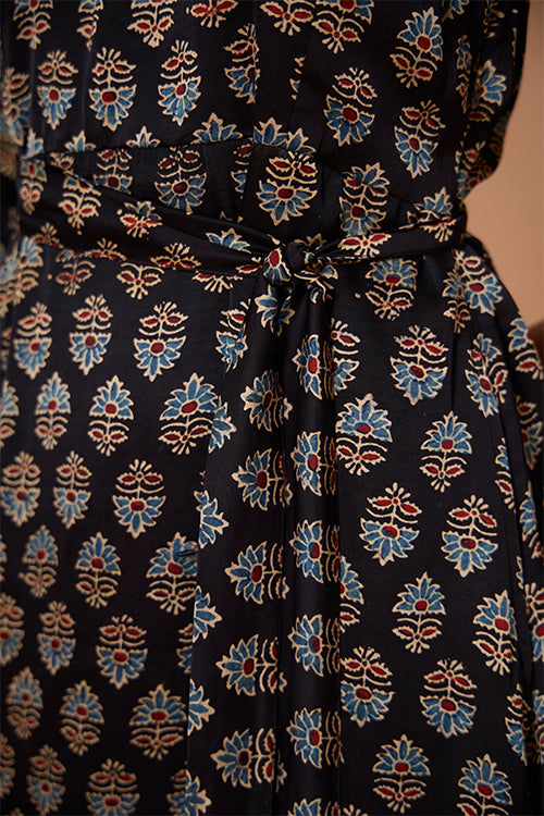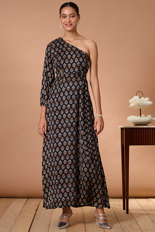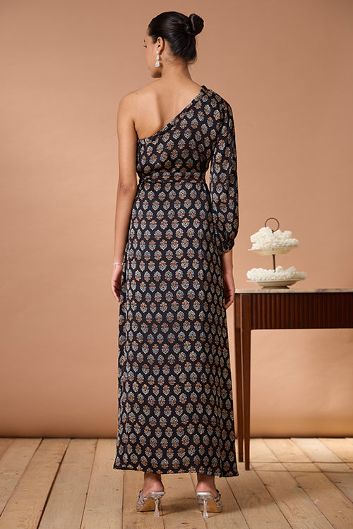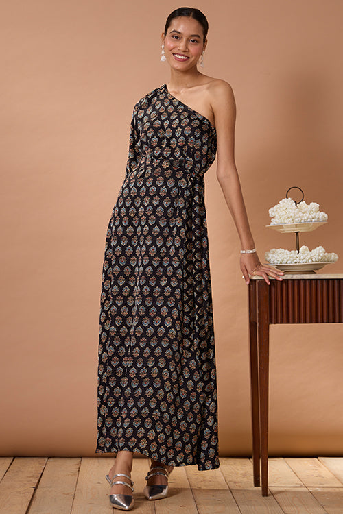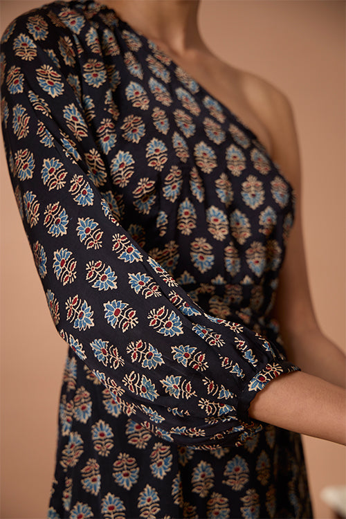 We have got the perfect festive dress for the fun-loving you- the playful yet elegant "Garnet Gypsy" One-Shoulder Dress! Pay an homage to the traditional crafts of Ajrakh printing as the pure modal black canvas of the dress boasts of glorious motifs. This long-length dress has a concealed zipper on the side and is elasticated on the only-shoulder side at the armhole and at the shoulder hole. Feel like a queen with the puffed look due to the gathered edge of the sleeve. An extra belt has been provided to cinch that waist if you want. Go the boho chic way as you add on some statement earrings, chunky bangles and just relax with your hands in the 2 pockets of the dress!