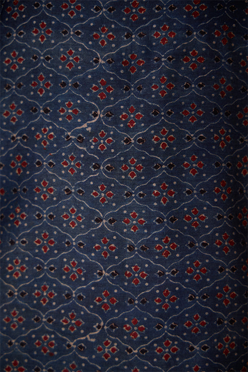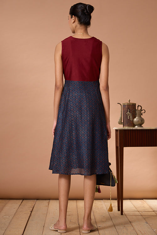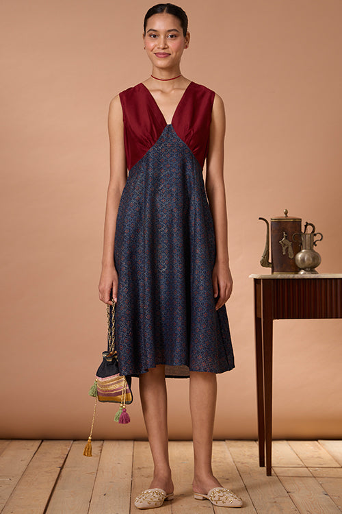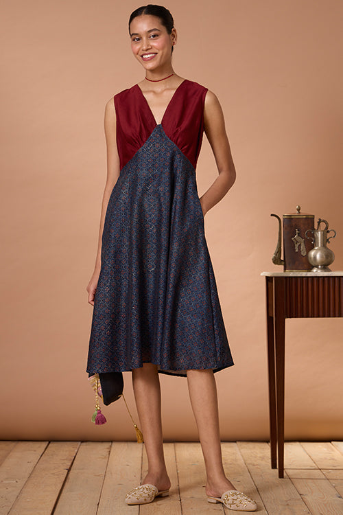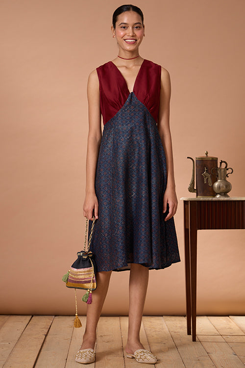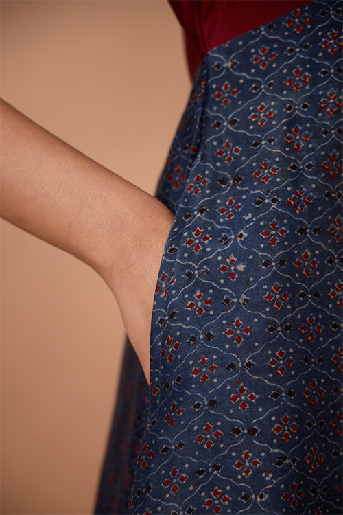 A poetry of peace and poise, this dress captures the essence of Ajrakh printing in new patterns. A silhouette ensured to make you feel graceful effortlessly, this sleeveless dress comes with a V-neckline and A-line cut. The two complimentary fabrics of the red yoke and blue Ajrakh flare make for a visual symphony. Adding drama to the dress, the dress is gathered along the bust. It comes lined below with comfortable Mul fabric and with a concealed zipper on the left side. And just when you thought the dress couldn't get better- it has 2 pockets for your utilities! You don't have to fuss about styling the dress because it is effortlessly extravagant- pair it with some dainty jewelry and you're good to go!