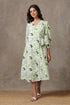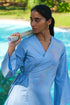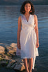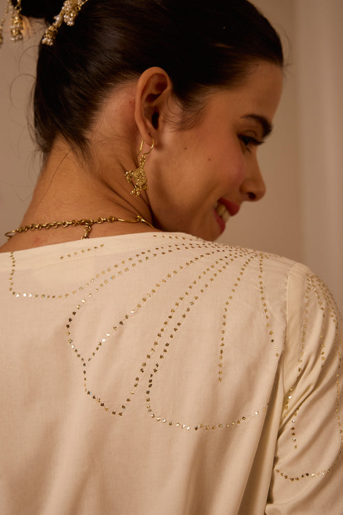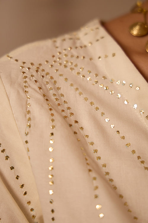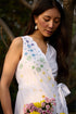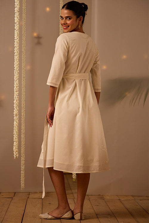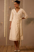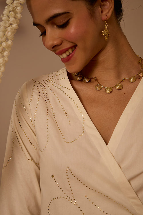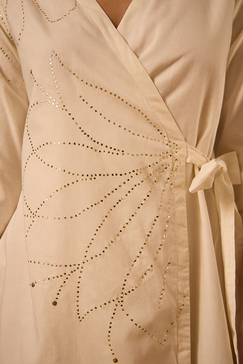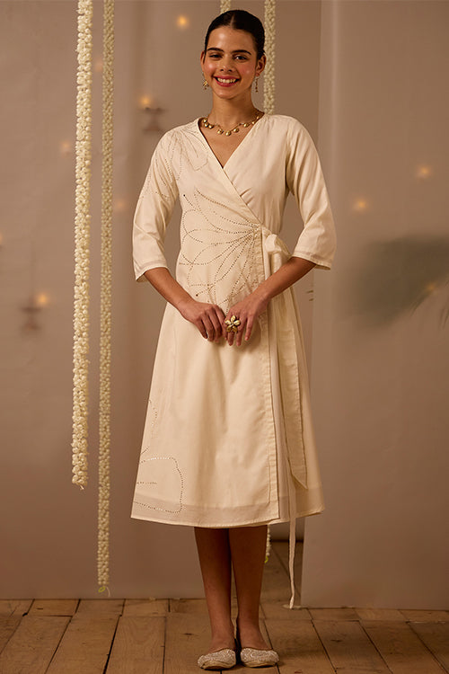 Adorn yourself in our "Lumiere" Wrap Dress, a wrap dress unlike any other you've put on before. Witness the exquisite play of Kasab or golden thread and sequins of Mukaish (or Badla work) embroidery running along the front, back, and on the right sleeve of the dress. Crafted from creamish white pure cotton fabric, we have taken care of your needs by providing lining underneath the entire dress and 1 pocket on the side. Embracing beauty in simplicity, the wrap dress hugs your figure, flaunting your curves and the shoulder loops with press buttons keep everything secured. Elevate your look by adding on statement jewelry from Okhai and tan sandals. Time to illuminate every event with your pristine presence as you don this simple yet stunning wrap dress!