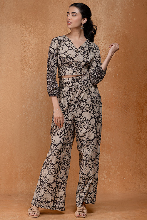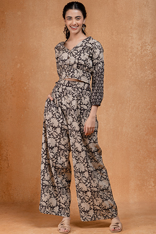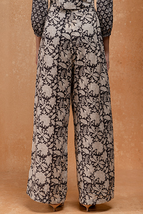 We bring to you "Lunar Reflection" Flared Pants, sure to become your new daily obsession. High-waisted and flared in silhouette, it hugs your body in the right places and provides you with all the comfort. With elaborate floral motifs patiently handblocked onto the canvas, the cotton fabric lets your skin breathe but in an effortless style. The wooden buttons and the fusing on the belt keep fit all snug and secure. With a concealed zipper on the side and 2 pockets on the sides to keep your essentials in, we've got your fashion in check without any compromise. Wear it along with a simple black tee or our "Sandgrain" Cropped Top, embody the free spirit within you!