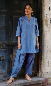 Step into sophistication with our "Magma" Kurta, crafted from pure cotton and adorned with a striking tie-and-dye print in stunning black hues. This kurta features a sophisticated stand collar and a functional front placket highlighted by wooden buttons. Each sleeve cuff is embellished with a single button, adding a touch of refinement. Gathers along the sleeve edges enhance its tailored look, while two side pockets offer practicality without compromising style. Perfect for both formal gatherings and casual outings, the "Magma" Kurta seamlessly combines craftsmanship and comfort, making it a versatile addition to any wardrobe.
