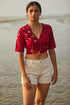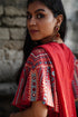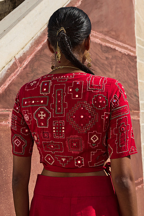 Introducing to you the "Nagara" Wrap Top, the perfect fusion of traditional craftsmanship and modernity. Crafted from pure cotton red fabric, this wrap top is lined below entirely with soft Mul fabric. Capturing the true essence of vibrant Indian festivities, this top features patient hand-embroidery with stem, running, buttonhole, Bavariyo, open chain and satin stitches with contrasting green glass beads and round and square mirrors in between adorning the front right side part, the back and on both the sleeves. Shoulder loops are present with press buttons for you ease. Pair with a ivory long skirt and statement earrings to let the mesmerizing Rabari inspired embroidery flair. Celebrate yourself in "Nagara" as you catch all the light and attention in the room!