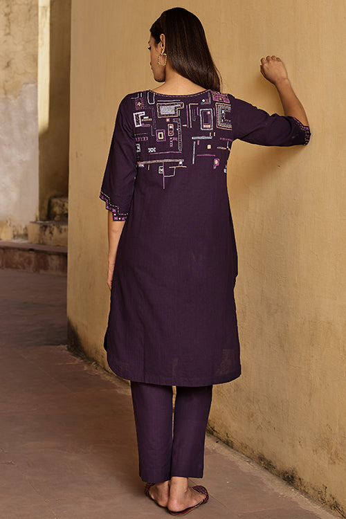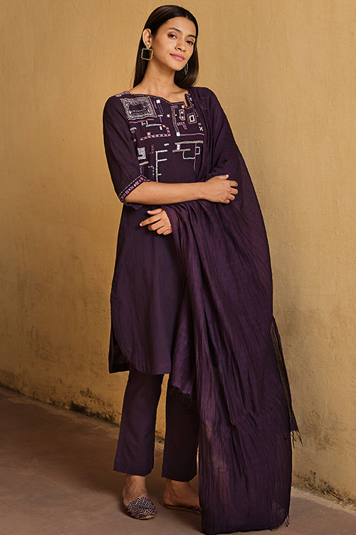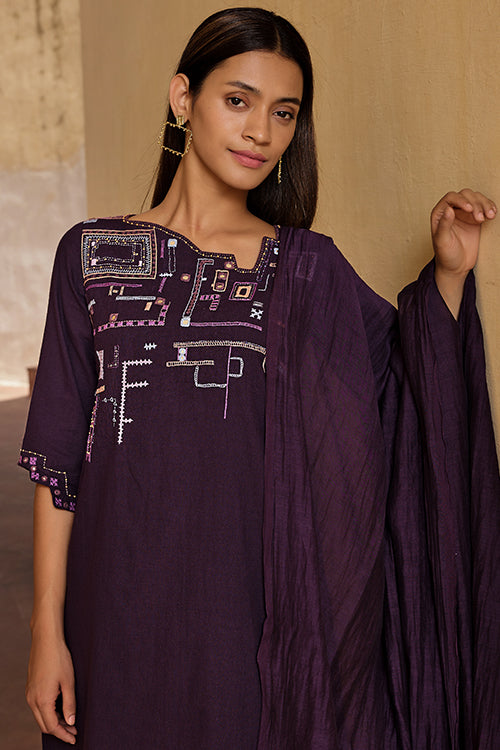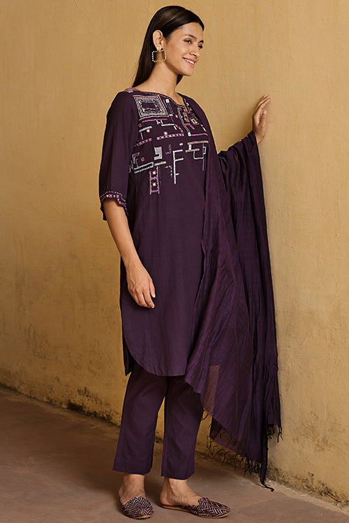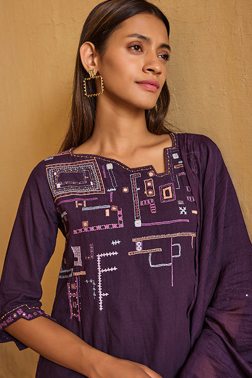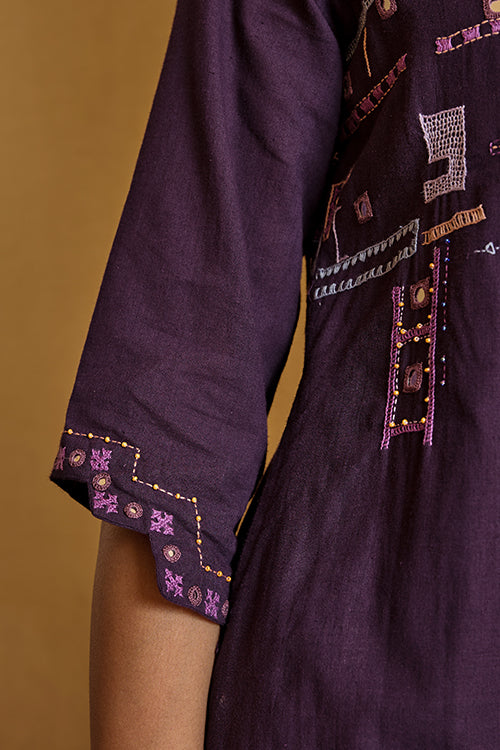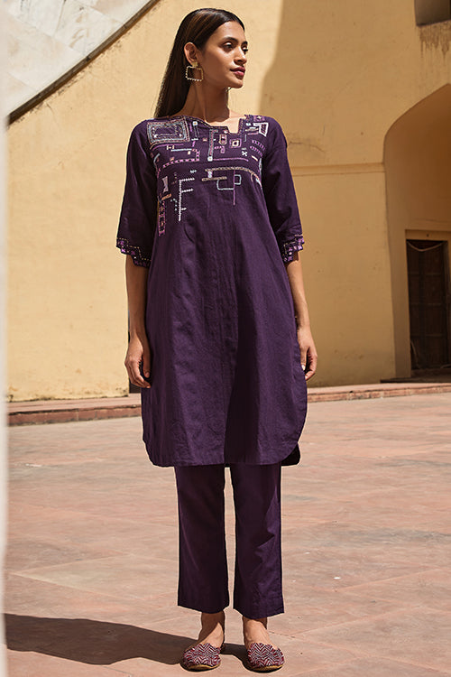 Be a sight to behold in this whimsical and playful Kurta Pant set! Crafted with love from pure cotton fabric, this kurta resets basic styles with its eye-catching uneven neckline and uneven sleeves edges. A visual treat and full of utilities, it's lined underneath entirely (excluding sleeves) with Cotton Mul fabric and comes with shoulder straps with press buttons. The front and back yoke and the sleeves edges have been hand-embroidered in Rabari tribe styles with running, chain, satin, feather, buttonhole, Bavariyo stitches with round and square mirrors and beads in between. The pant in included in the set comes with elastication at the back for the perfect snug fit. Wear the Chanderi Silk Dupatta provided around you for the ethereal festive feel. And no, we didn't forget the pockets- the kurta has 2 pockets on the sides. Get ready to bedeck yourself in this fiesta of craft tales and receive tons of compliments!