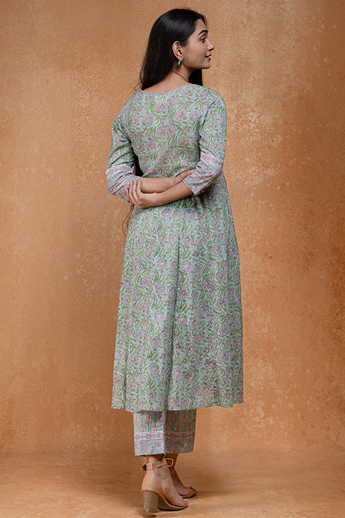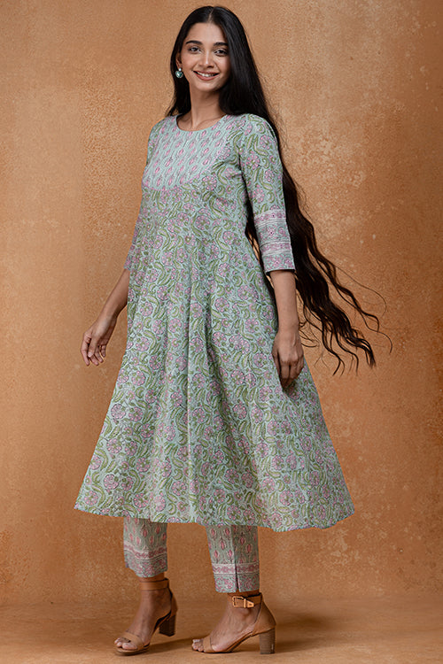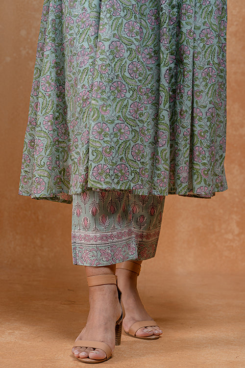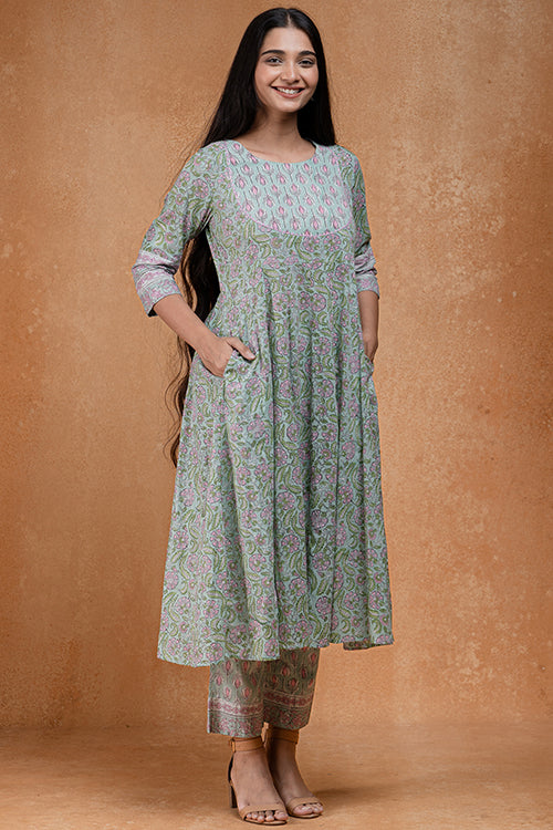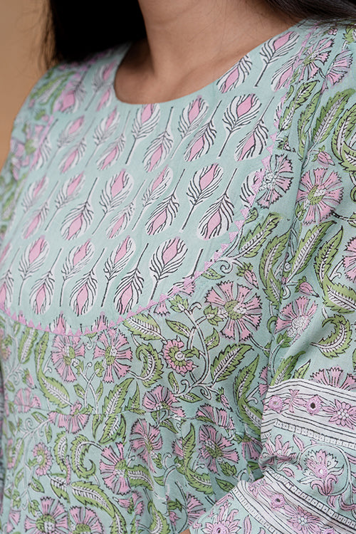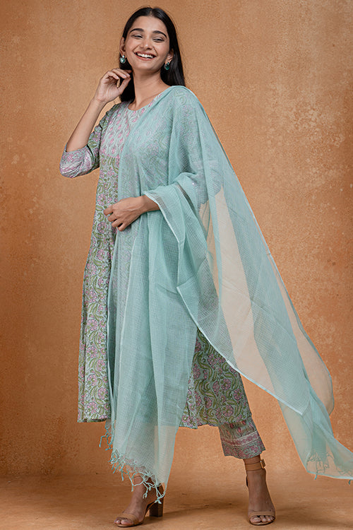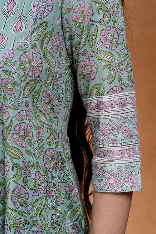 Pure bliss and uncompromising comfort, glide in with our "Ocean Mist" Kurta Pant set. Handcrafted from pure cotton fabric, the flared kurta and pair of pants showcase 3 different types of majestic block prints all over. To add visual contrast, striped fabric makes up the edge of the sleeve horizontally and the bottom hem of the pants. Elevating the already serene look of the kurta are the Triangular hand-embroidered border on the front yoke and at the back neckline (kaangri), and eye-catching mirrors on both the sleeves borders. The kurta comes with 2 handy pockets. Wear the kurta simply as a dress as it has no slits or go all the way by wrapping around the dreamy Kota Doria Dupatta included in the set. A daytime event, or a family brunch, whatever the occasion- you'll look absolutely ethereal!