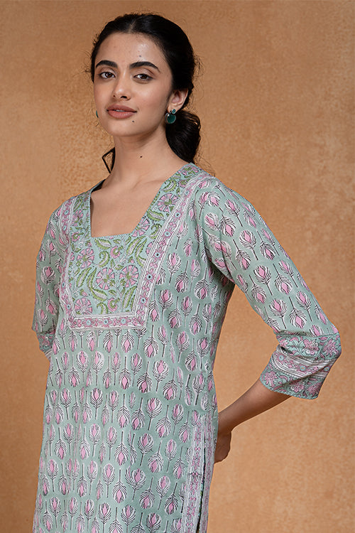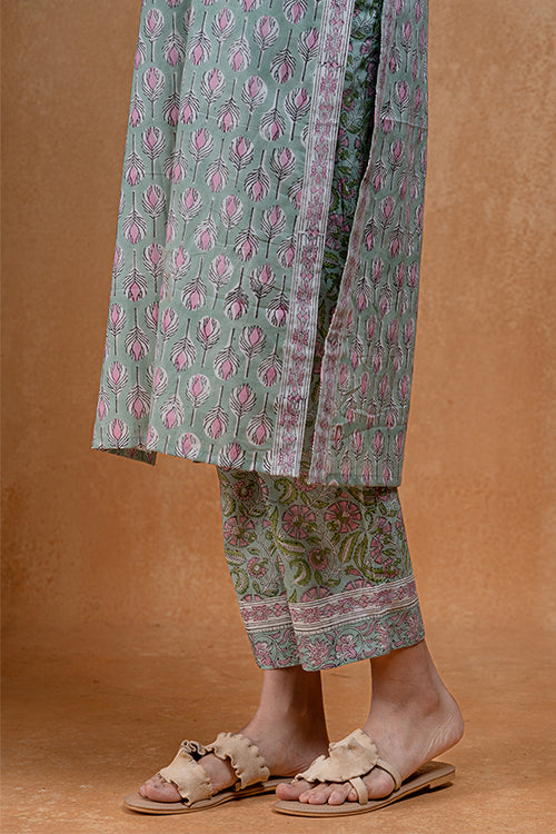 Be a peaceful and enchanting vision to behold everytime you step in our "Pistachio" Kurta Pant set. Handcrafted from pure cotton fabric, the straight kurta and pants display a mesmerizing combination of 3 different block prints. Adding a visual contrast, you'll find striped fabric as horizontal borders on the edge of the sleeves and at the bottom hem of the pants. Comfort blending with a flattering silhouette, the front and back neckline boast patiently hand-embroidered triplet buttonhole stitches. Eye-catching mirrors have been added on both the sleeves border and the yoke part. The kurta comes with 2 slits on the side for easy movement, and the pants are elasticated at the back and have 2 handy pockets. Complete your look by wrapping the dreamy Kota Doria Dupatta around you and adding on some silver jewelry.