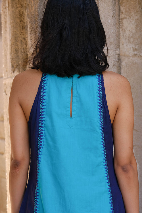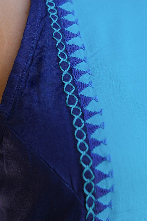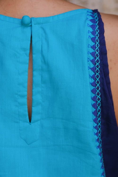 Crafted with love from vibrant blue Mul fabric, the long silhouette of this sleeveless kurta flaunts your shoulders and gives an alluring charm. The unique embroidery of small triangles with satin stitches on the front and back side draws your eyes to the impeccable craftsmanship of our artisans. With your needs as our priority, the kurta comes equipped with 2 pockets on the sides. You can wear the kurta like a gorgeous dress or you can pair it with the straight pants included in the set. The pants are elasticated at the back to keep you all snug and secured. Comfortable, Versatile, and Glamorous- this set checks all the boxes. Time to make it yours!
