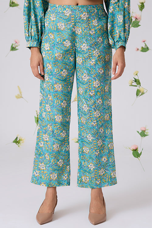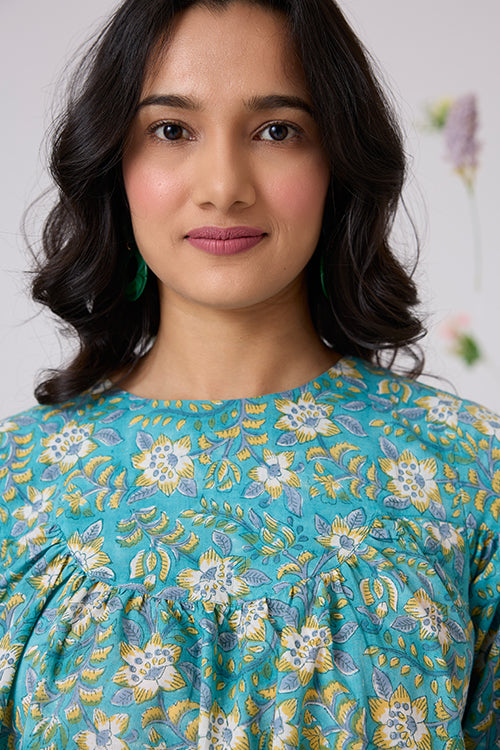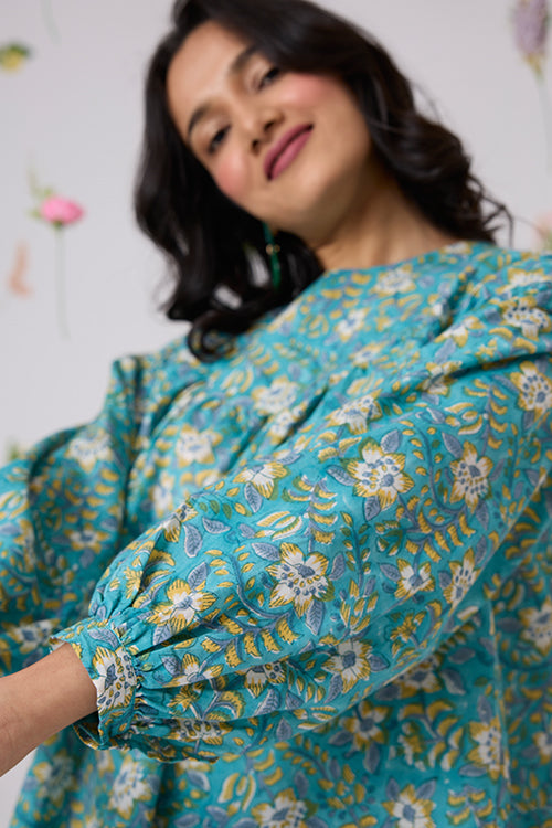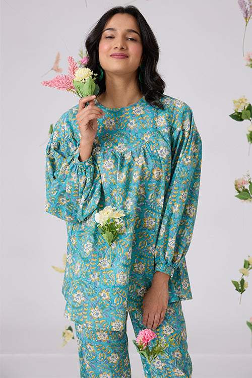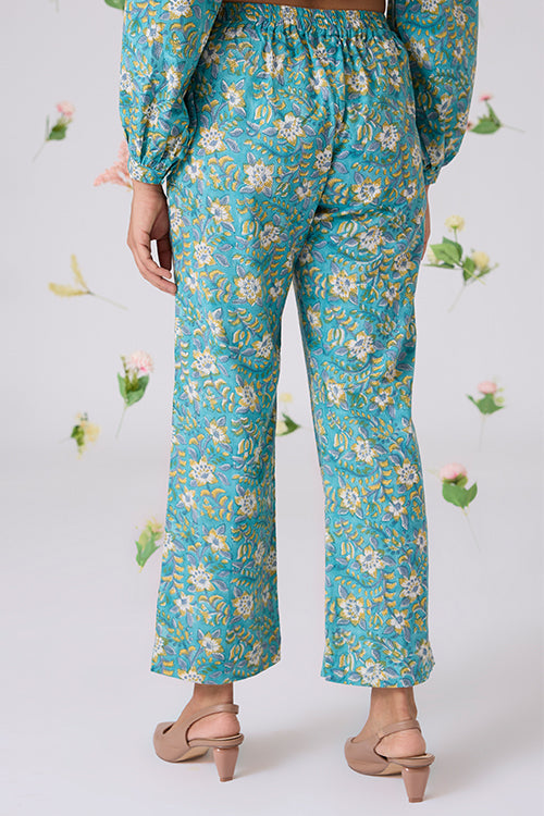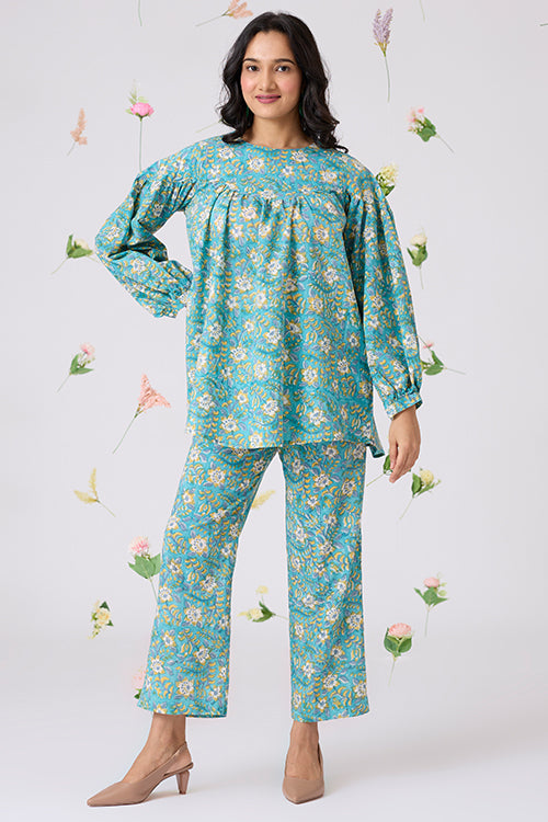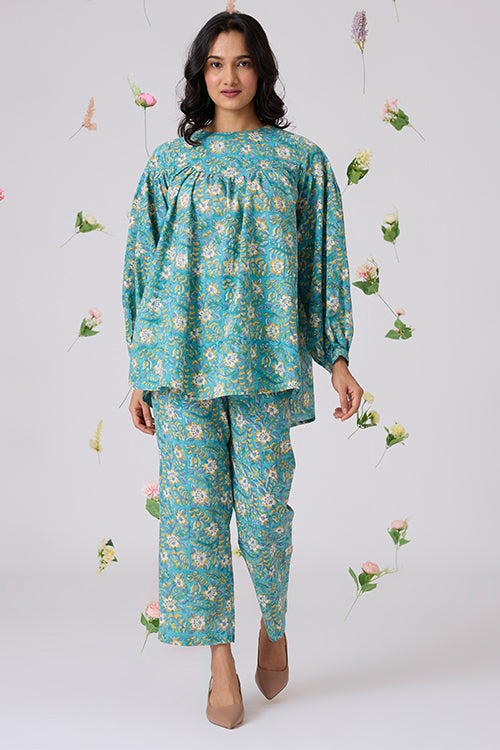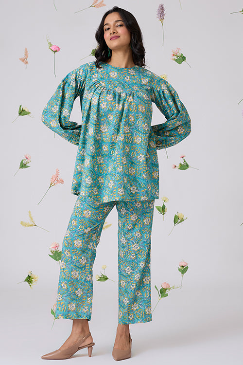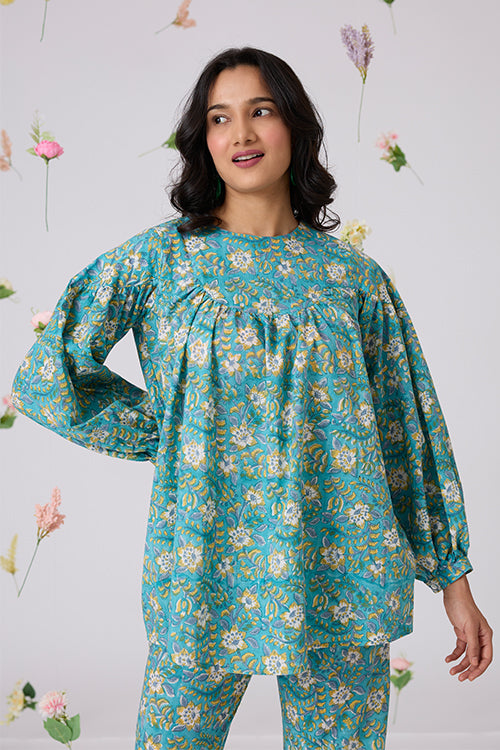 Your search for a versatile top pant set ends here! Introducing "Solitude," this set features vivid handblock printed florals onto a canvas of green pure cotton fabric. The top comes double layered in the front and the back yoke. Minimal Mother of Pearl buttons on the sleeves cuff and at the back provide closure. The top is gathered in the front and back as well as on the sleeves, bringing both comfort and fashion into one. The pants are elasticated at the back for a snug fit. Put on this set and strut down, with your hands inside the 2 pockets on the sides. Elevate your look as you put on some danglers and nude sandals. Head out in effortless fashion as you wear "Solitude" next time you meet the girls for a brunch!
