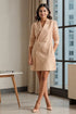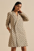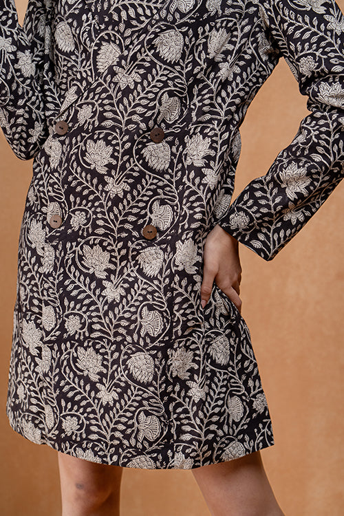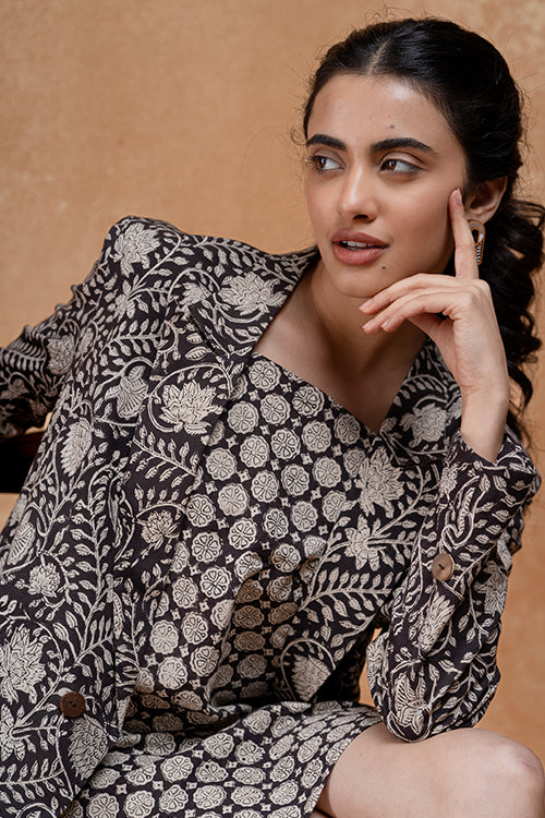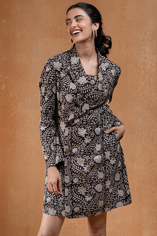 Giving the pep talk? Do it in an effortlessly cool and chic way as you put on our "Ruminate" Blazer Dress. Crafted from pure cotton fabric, it showcases the poetry of patterns made possible through the art of hand-block printing- with flowers and foliage printed all over. The dress is equipped with fusing in the collar to keep its shape and wooden buttons are provided in front and on the sleeves cuffs. Layer it on with a top of your choice and button the dress all the way or wear the sling slip with circular print fabric that comes with it underneath. And no, we didn't forget 2 pockets on the sides for you. Seamlessly switch from office meeting to office party mode with "Ruminate" and your smile on!
