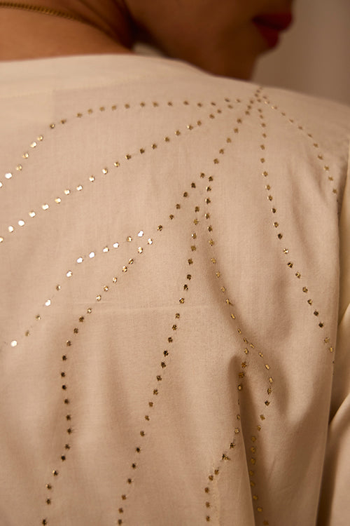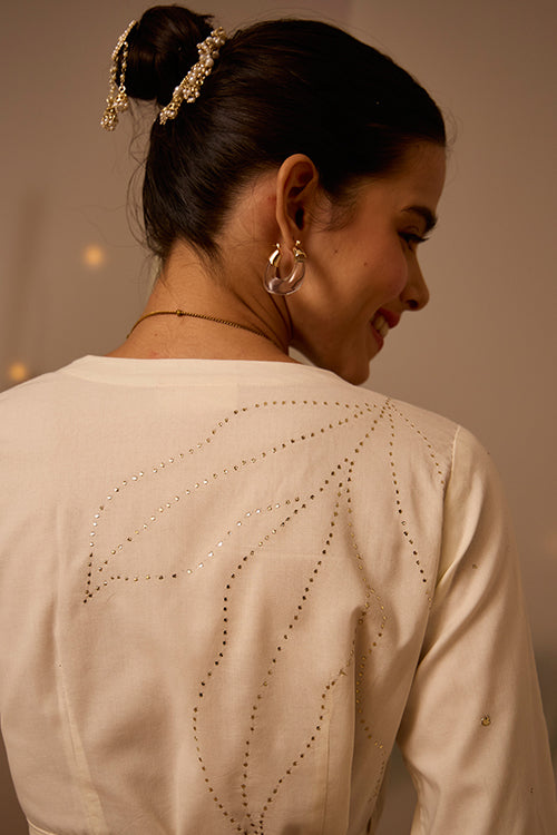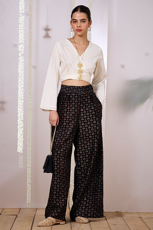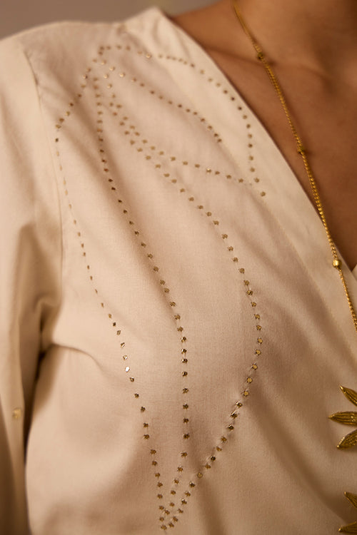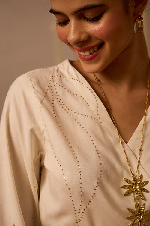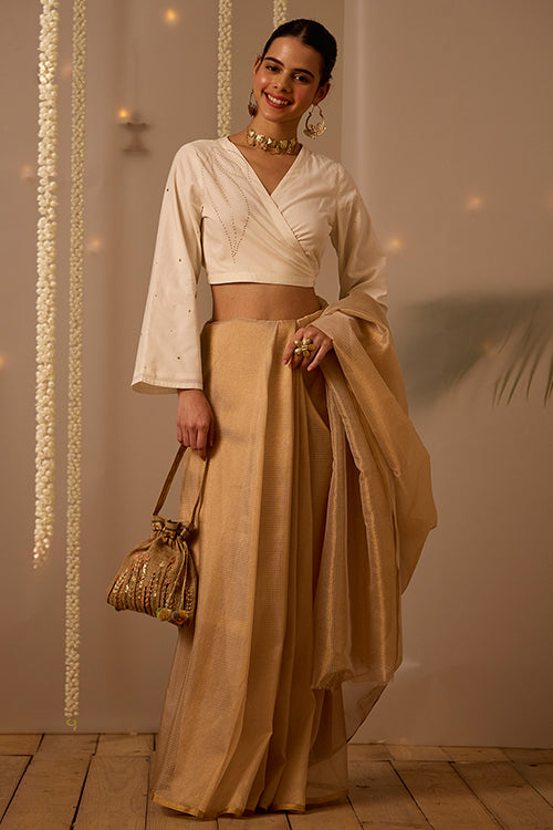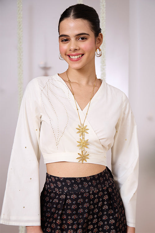 Be your radiant self as you put on our "Shine" Wrap Top- a stunning piece of gilded poetry. An ode to the ancient craft of Mukaish or Badla work of Lucknow, our artisans have fused its essence into a modern wrap top. A glorious floral motif in Mukaish embroidery stretches from the front to the back, accompanied by scattered Badlas on both sleeves. The top is complete with lining underneath to give you coverage. Channel your boho energy as you discover a new city wearing this wrap top, a pair of flared pants, statement jewelry, and a sling bag.
