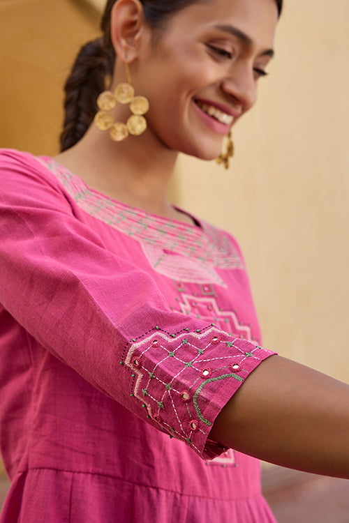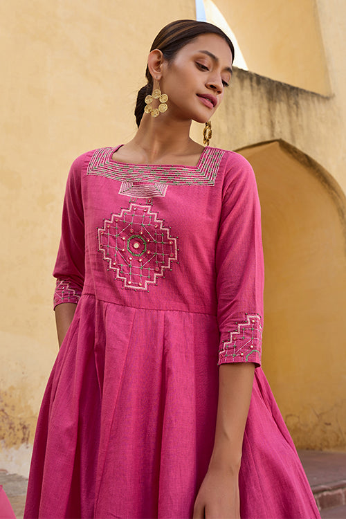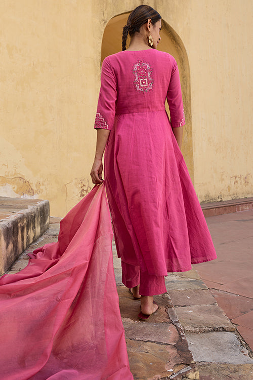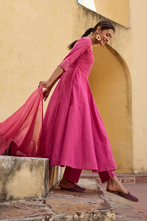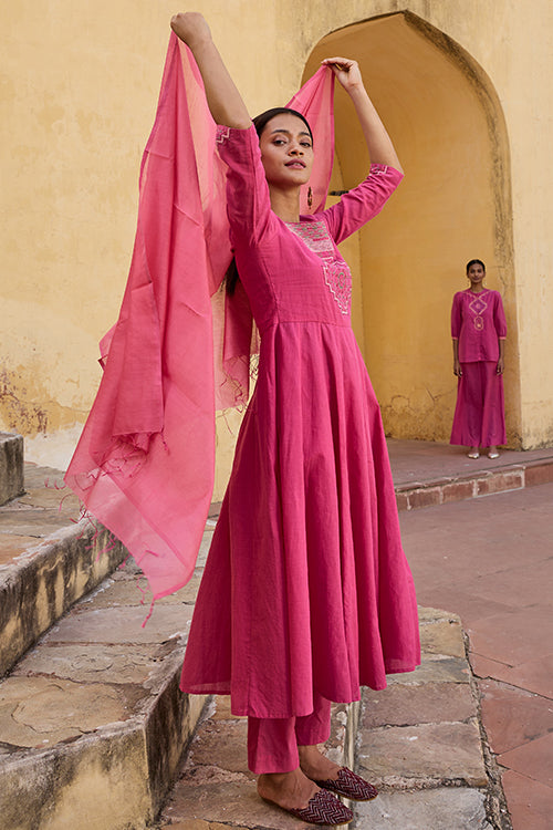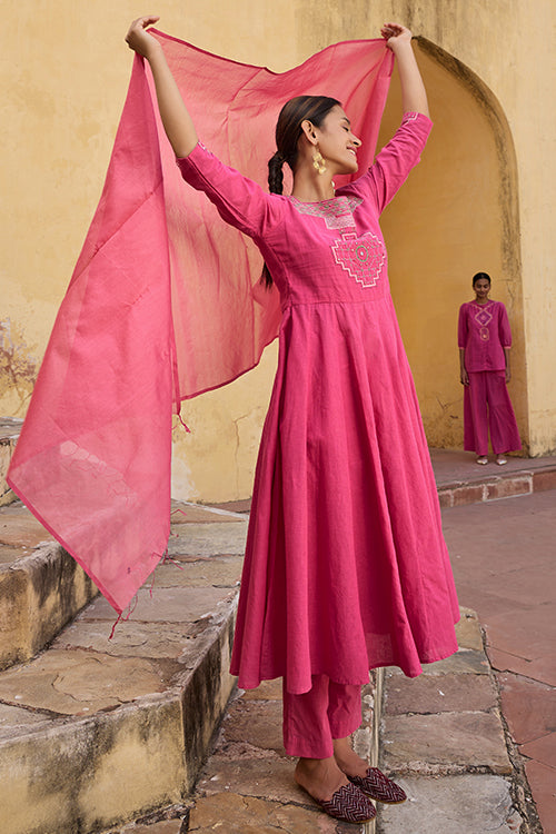 It's the season for you to bloom in the rosy hues of our "Sundial" Kurta Pant Set. Handcrafted from pure cotton, the kurta has a statement square neckline and comes lined under the yoke part with Mul Cotton fabric. Utilities? We've got you covered with the shoulder straps with press buttons and 2 pockets on the sides. Prepare to be mesmerized by the intricately hand-embroidered front and back yokes and the sleeves with running, chain, satin, feather, buttonhole and Bavariyo stitches with round and square mirrors and beads in between. The pants included in the set come elasticated at the back for a perfect fit. Wrap over the Chanderi Silk Dupatta that comes in the set and there, you're ready to step into the festivities in all your unique glamour!