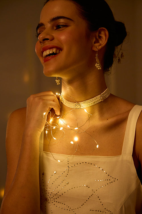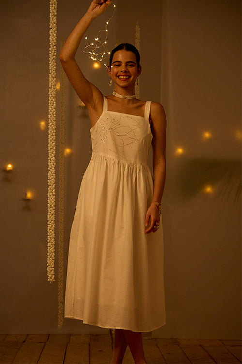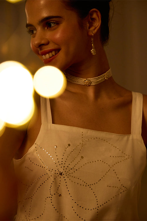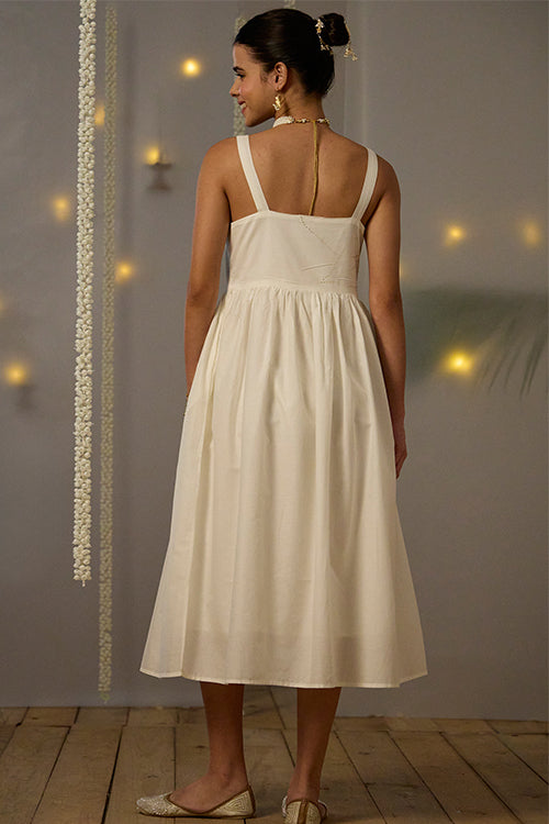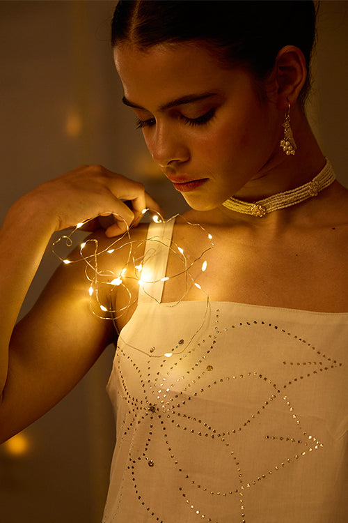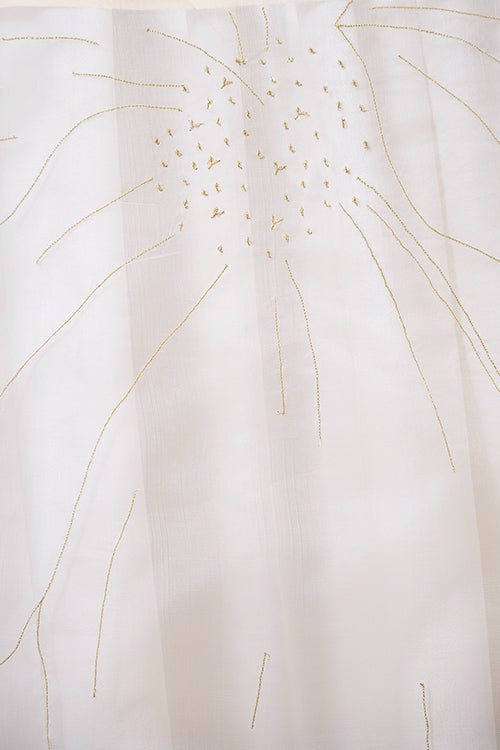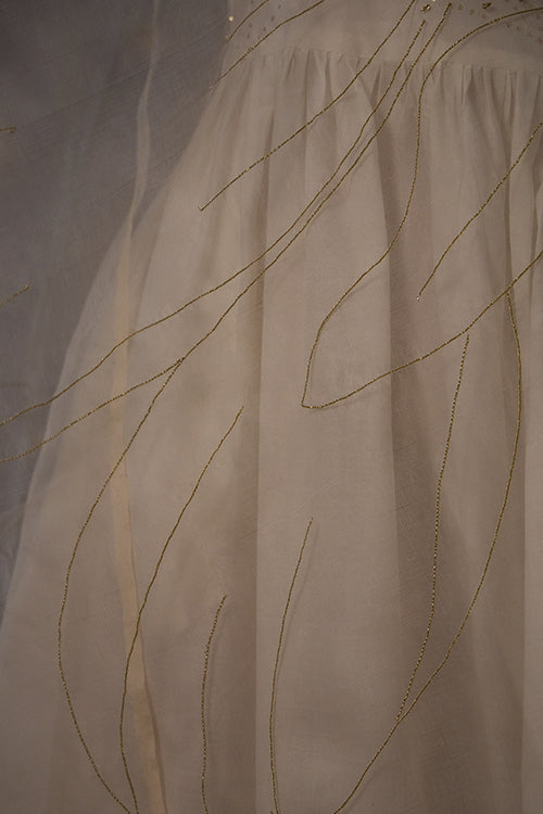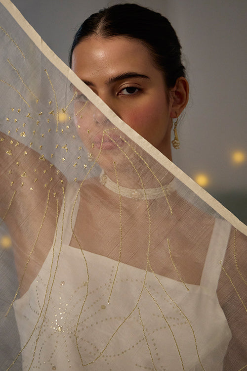 Let us dress you up in elegant decadence in our heavenly "Tara" dress. Crafted from creamish white pure cotton fabric, the sling dress tells tales of the ancient craft of Mukaish embroidery with golden sequins in the pattern of majestic floral motifs on the front and back yoke. The gathers on the waistline subtly flatter your silhouette. The dress is equipped with lining all over underneath to provide you opacity. Blending traditional tales and comfortable attire, we've taken care of your needs with pockets on the sides. Pair it with the ethereal organza Dupatta featuring similar floral motifs in Mukaish work all over and grace every event with your radiant presence!