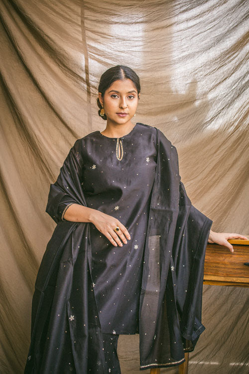 A dark black chanderi kurta with matching heavily embroidered sharara has been designed into a festive kurta that will make you feel comfortable. The Souma kurta features zari, dabka, and sitara work on the fabric. You can wear it with a pure chanderi black sitara work dupatta that has been lovingly embroidered with aari work by Uttar Pradesh artisans. Handcrafted pieces can make you feel special at weddings, festive occasions, family gatherings, and celebrations. 3 piece kurta, pant, and dupatta set
