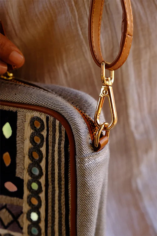 For those seeking a sustainable vegan leather option, this bag is crafted from 100% vegan leather and features stunning geometric embroidery in shades of blue, white, and grey, accented with mirrorwork - all hand done by the women artisans of Okhamandal. Designed with versatility in mind, it comes with an adjustable shoulder strap and a waist belt, allowing you to style it as a sling bag or a fanny pack. Thoughtfully structured, it includes two compartments and an inner metal-zip pocket to keep your essentials organised.