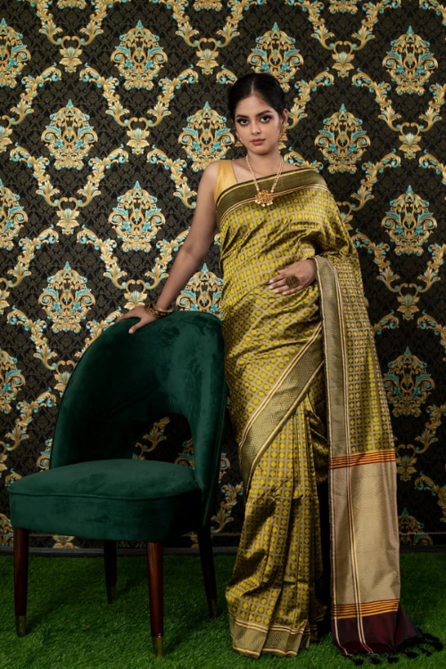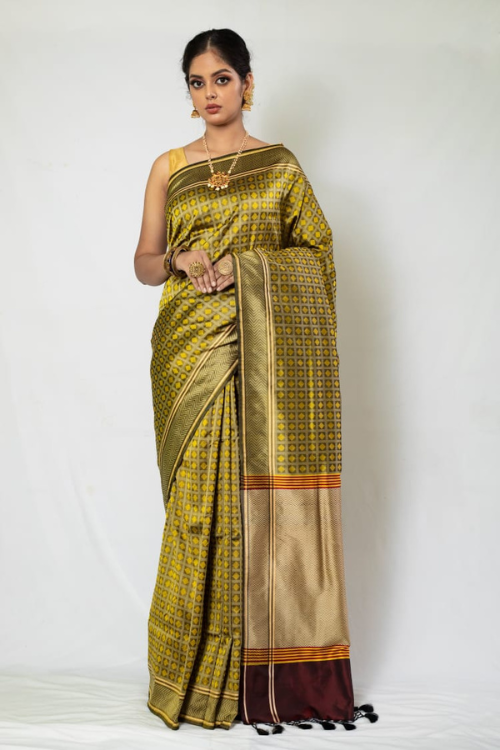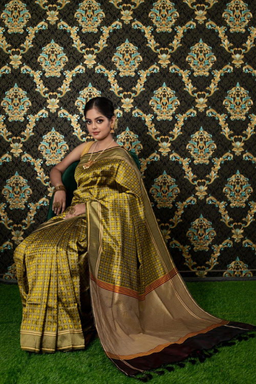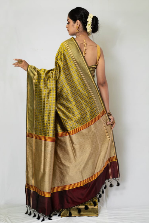 "VWAS" Brown Green Handloom Banarasi Pure Katan Silk Tanchoi Saree