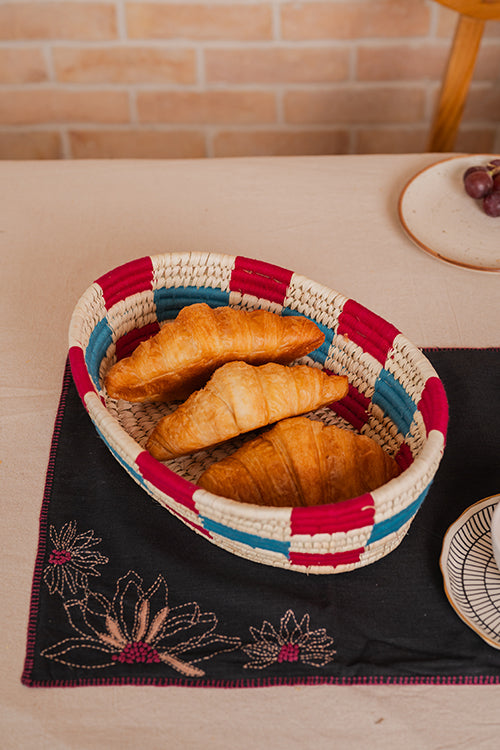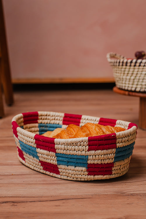These chequered Handmade Trays have bright blue and magenta pattern work and are an absolutely a delight to your eyes. They can be used as a fruit tray or simply as on organiser to store your essentials. They are made of Kanshi Grass & Palm leaves and carefully woven by Sabar Tribal artisans. All of our products are natural, handcrafted, and environmentally friendly .The product is strong, durable, and lightweight to move around. Ambalika is a Not For Profit organisation working hard to save nearly extinct Sabar tribe of India by promoting their tribal art .Our artisans live and work in the comfort of their tribal hamlets and receive training from the best mentors in Design and fashion industry. They create products in an environment of joy, honor and respect. The same values find way into our products that are painstakingly crafted for customers and patrons who believe in keeping art traditions alive.