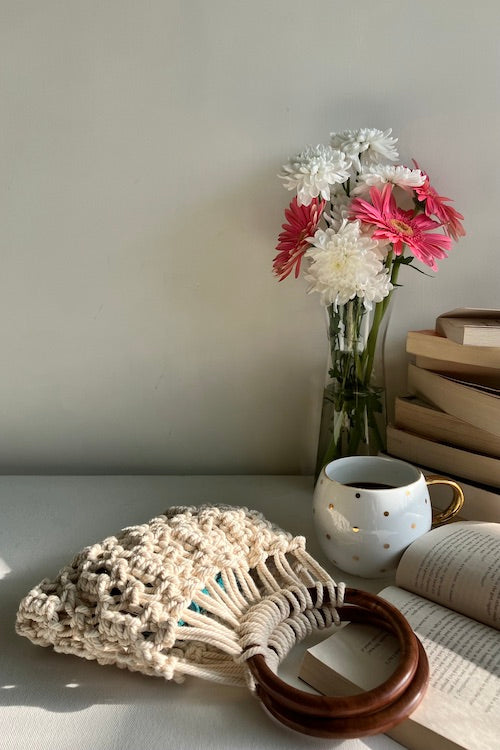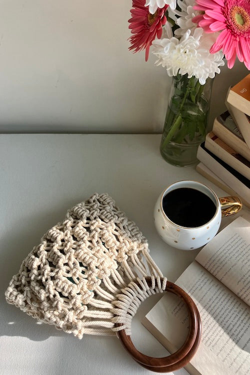 Whether you're heading out for a casual stroll, attending a social gathering, or simply want to add a touch of bohemian flair to your ensemble, this macramé handbag with top-quality wooden handles is the ideal accessory. Its fusion of beauty, functionality, and handcrafted artistry makes it a must-have for those seeking a unique and versatile accessory.