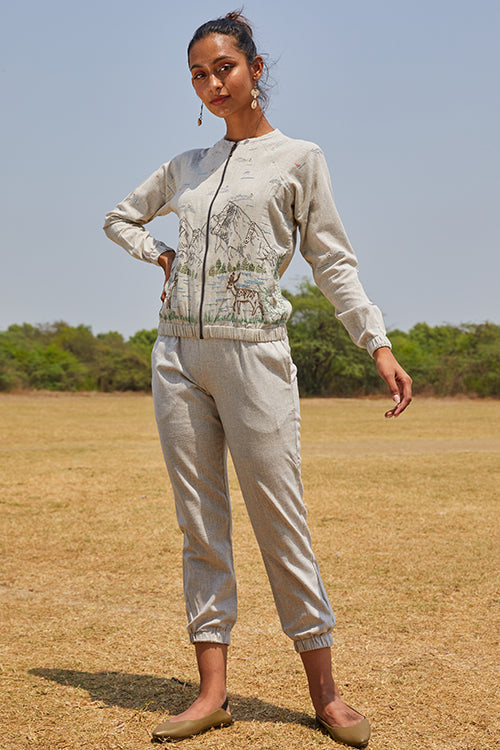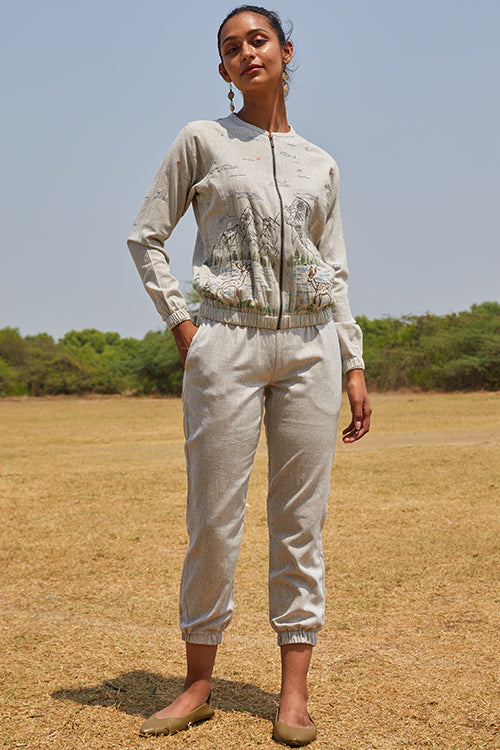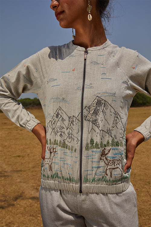 The aquatic ecosystem awaits your company in its full glory in this Indigo Bomber Jacket. A lively overview reimagined through the art of hand block printing onto pure cotton fabric, this Jacket comes double layered on its front and back yoke. Blending functionality with our fashionable fishes, the sleeves edge and waistline are elasticated for a snug fit and of course, the mandatory 2 pockets on the sides. The picture comes to life all the more, with mirrors embroidered on the front back and on sleeves, recreating the glistening waves under the sunlight. Wait no longer and embrace yourselves in "Freshwater Medley"!