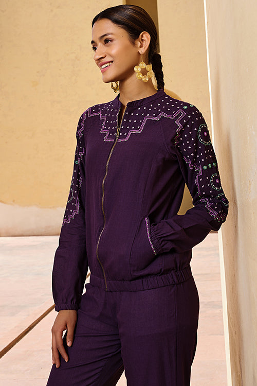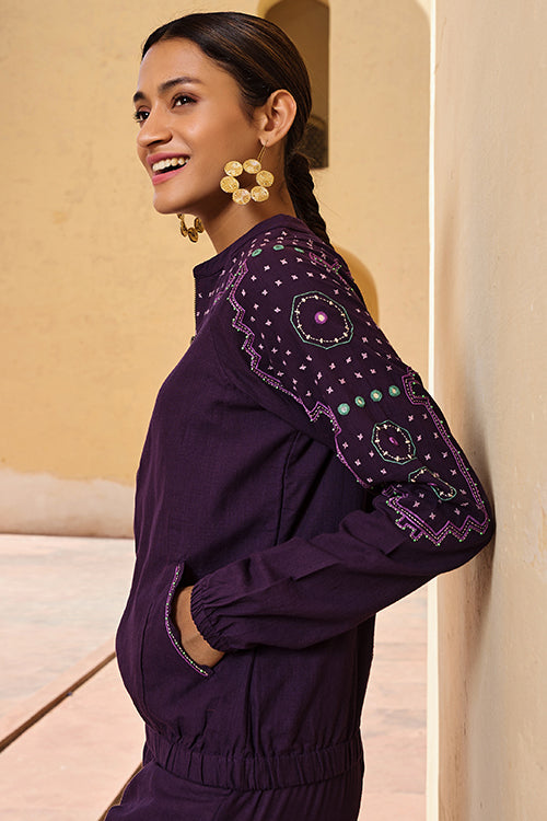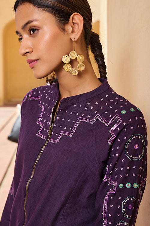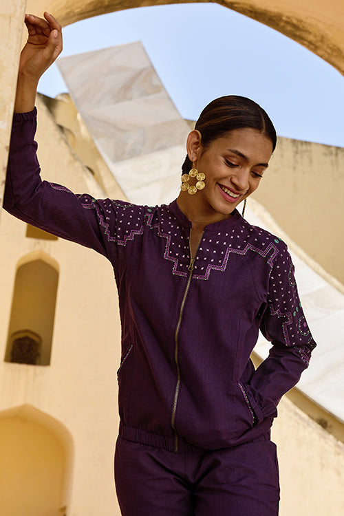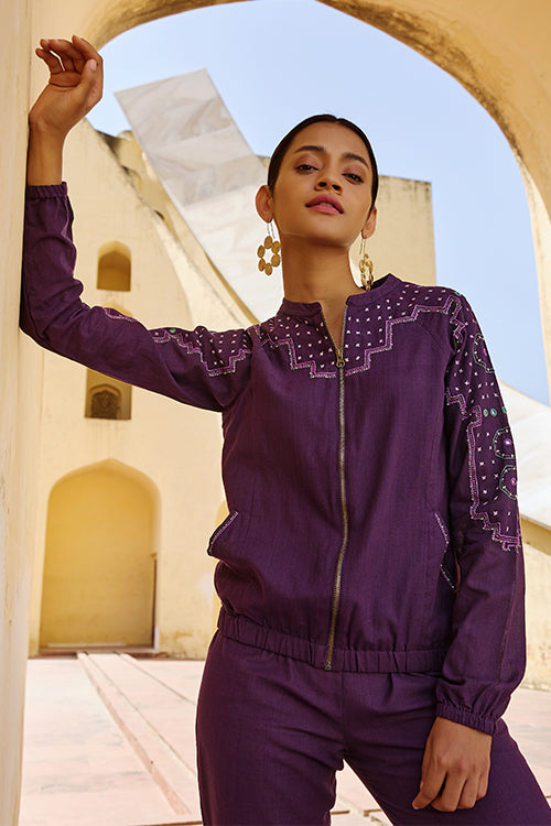 Drawing inspiration from the marvelous carvings of Jain Temples and embroidery techniques of the Rabari community, "Kalyanaka" Bomber Jacket is for you, the uber cool! Handcrafted from pure cotton purple fabric, it comes double layered in the front and the back. Catching your eyes are the contrasting green coloured beads, embroidered in geometric patterns with chain, Bavariyo, running stitches with mirrors and beads used in between on the front, the back and on both the sleeves and pocket opening. Yes, this jacket is equipped with 2 bone openings for your utilities. Wear it over a tank top and classic denims to show off the meticulous embroidery.