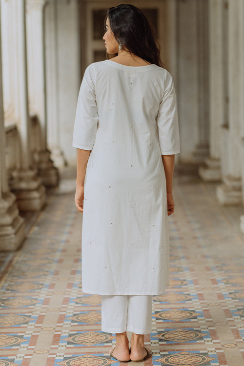 Handcrafted on a pure cotton fabric, the high slit kurta is carefully scattered with glistening mirrors in the front, on the sleeves and in the half-back bottom to add a certain kind of charm to its simplicity. Provided with monochromatic straight fit pants, the set is can be styled in several ways according to the occasion. The pants also come with elastic at the back for a comfortable fit. Pair the set with silver accents for a chic ethnic look or mix and match with kurta and pants with contrast colours to make unique looks.