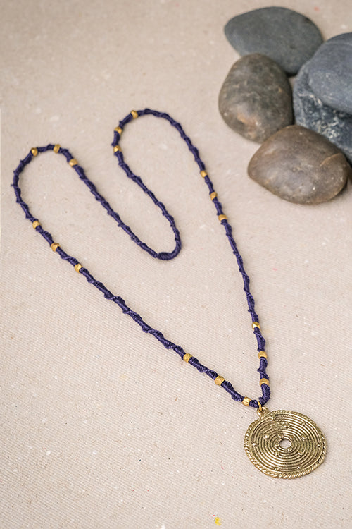 Handcrafted brass metal alloy dokra beads & thread work necklace along with a pendant, handmade by tribes. Dokra system of metal casting is said to be the oldest form of metal casting and is technically known as ‘cire perdue’ or lost wax process. The technique of casting revolves round replacement of wax with molten metal by the traditional hollow casting method.