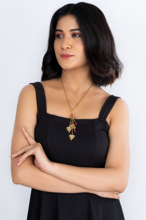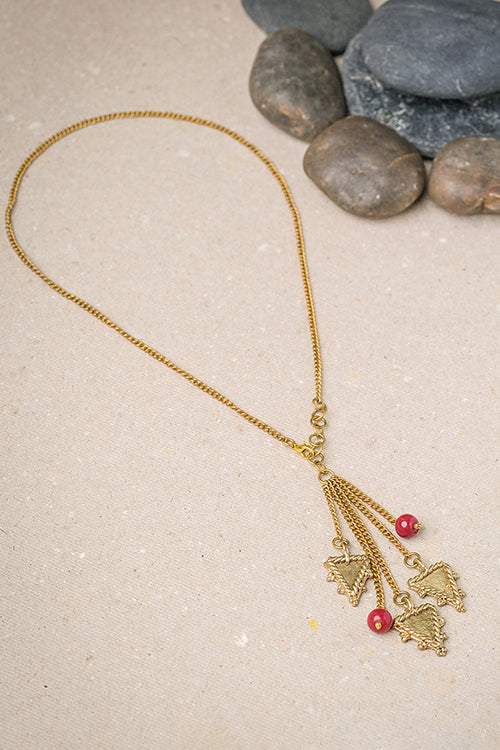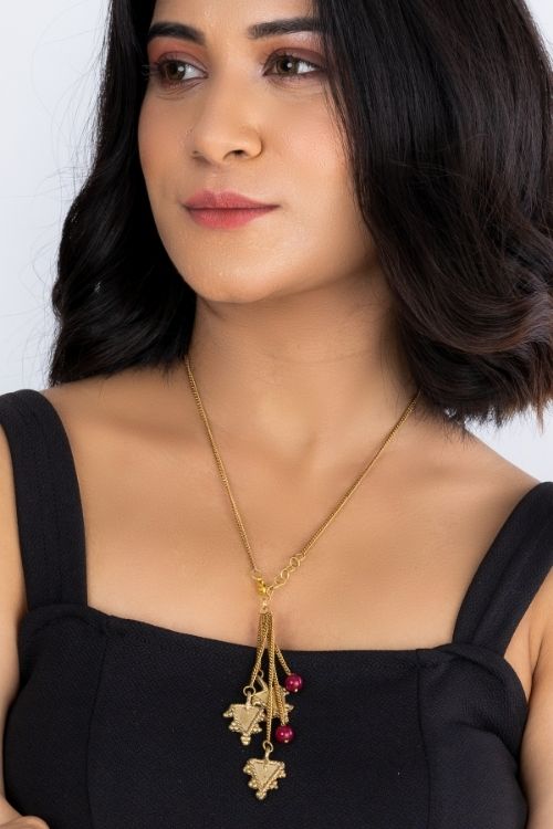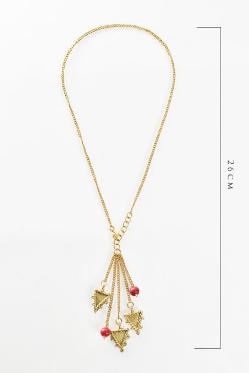 Handcrafted brass metal alloy dokra beads & thread work necklace along with a pendant, handmade by tribes. Dokra system of metal casting is said to be the oldest form of metal casting and is technically known as ‘cire perdue’ or lost wax process. The technique of casting revolves round replacement of wax with molten metal by the traditional hollow casting method.