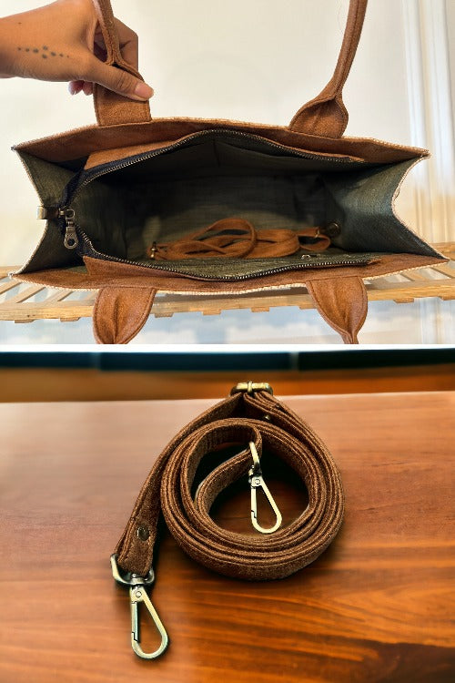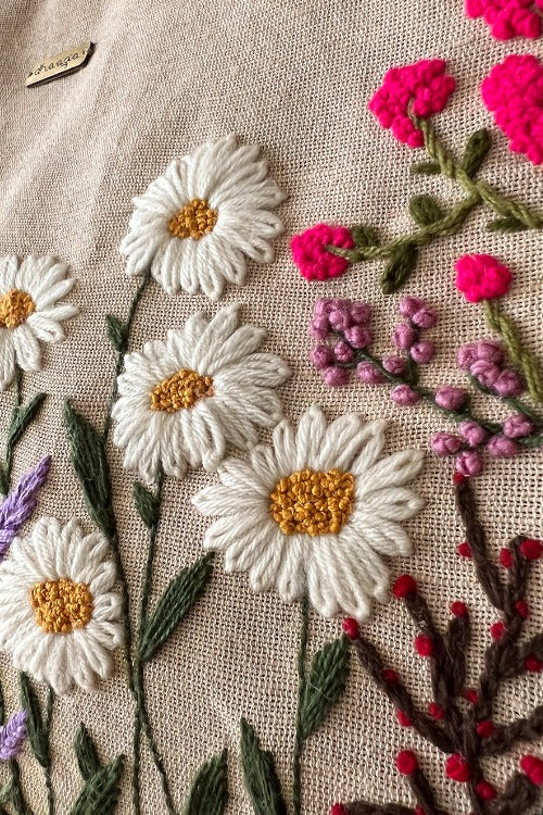 "Garden Tote, meticulously hand-embroidered using skillful techniques on natural juco fabric and vegan suede. This eco-friendly tote features a premium YKK zipper, an attachable and adjustable shoulder strap, and sturdy metal studs for support. Personalize it with a custom name or word for a unique touch. This irresistible and unique tote seamlessly blends fashion and functionality, perfect for daily use or special holidays. Adored by celebrities, working women, mothers, and sisters in India and abroad, it's a design cherished by women worldwide. Enhance your daily routine with a touch of floral elegance!