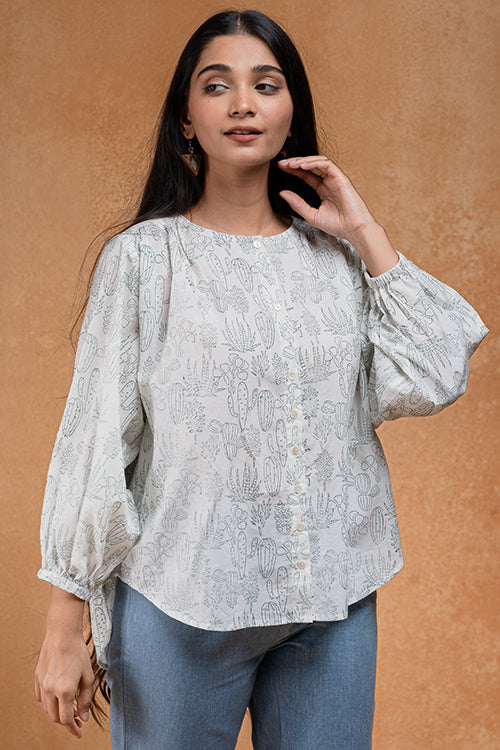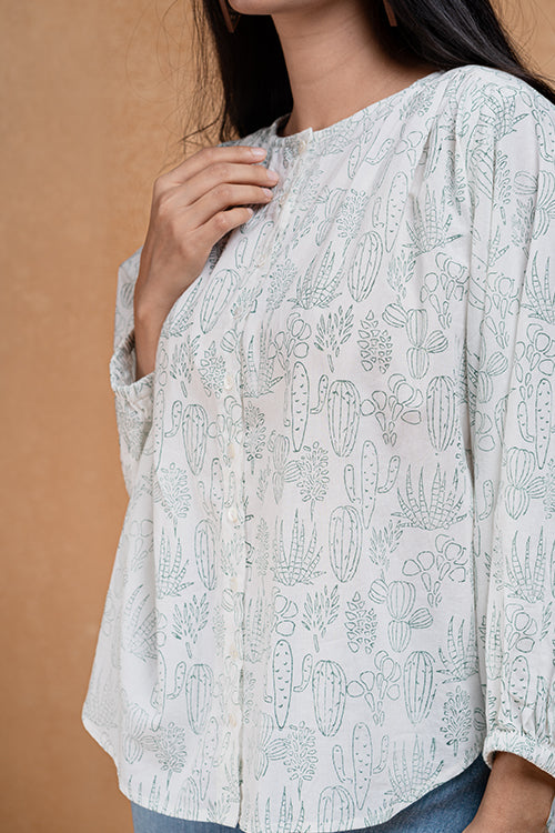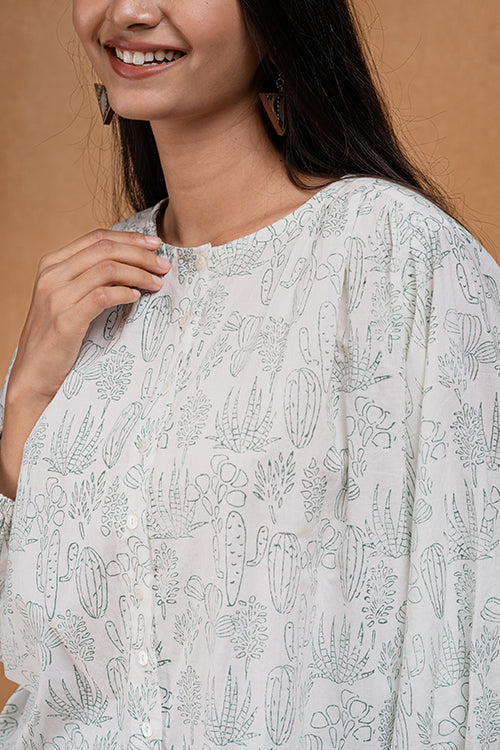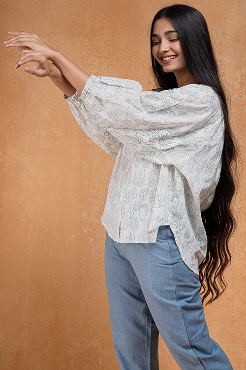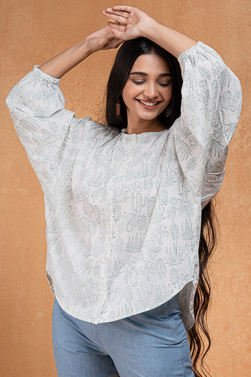 Take refuge from the prickly heat in this anti-fit loose top handcrafted from pure cotton fabric. Soothing to the skin as well as the eyes, the top features unique cacti print handblocked all over the white canvas. Bringing in utility, the front placket is fully functional with minimal Mother of Pearl buttons. The gathers on the shoulder and on the back yoke give all the more flowy feel to this ultra-comfortable top. Finally, the edges of the sleeves are elasticated, further elevating the look. The ideal workwear top for the days you want to feel laid back, pair "Desert Flora" with greige pants and some silver jewelry.