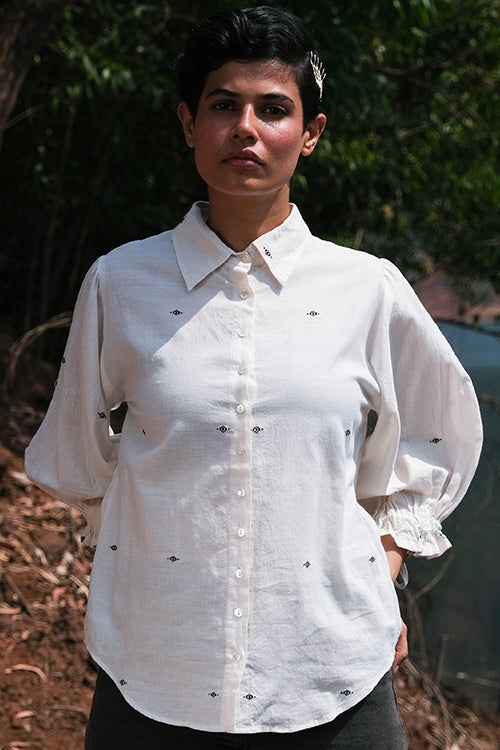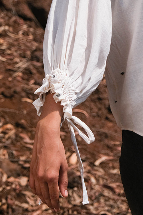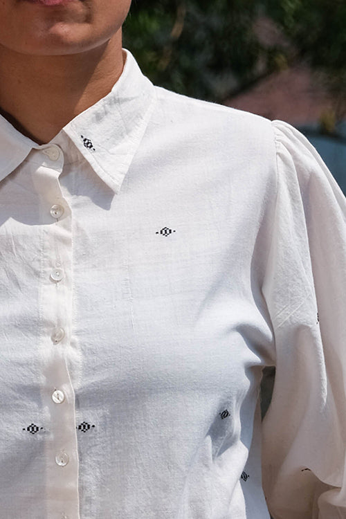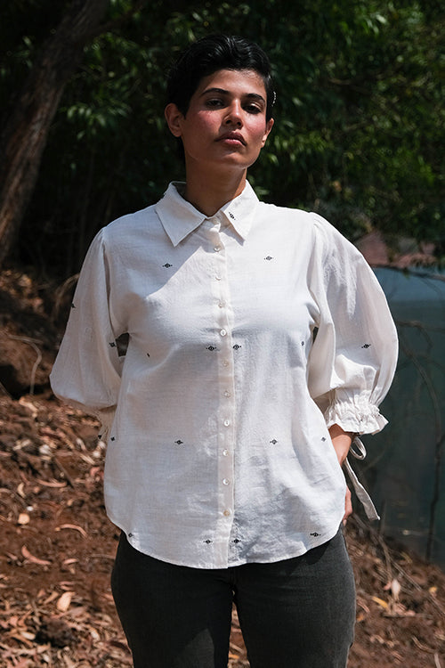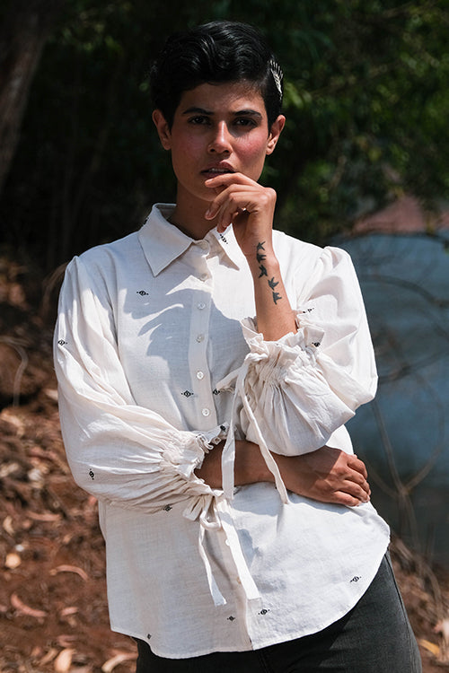 You'll never want to take it off with this breezy handwoven shirt. Designed in lightweight cotton, adorned with scattered dobby weaves all over the back & front of the shirt, this garment will make you feel like a flying piece of paper in the air! A classic collared shirt yet sleeves elevated with little gathers detailing and string to tie it around. Our 'Euphoria' is just what your next purchase needs to be! Dress up your evening in our breezy, bright and buzzy 'Euphoria' - the perfect statement piece for a summer getaway.