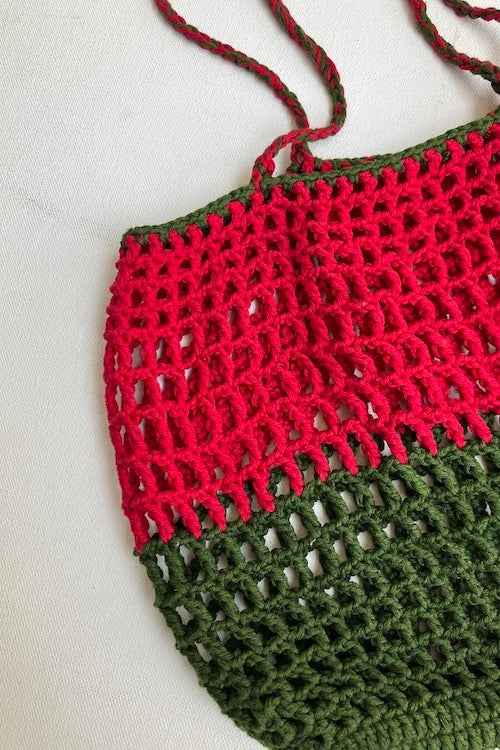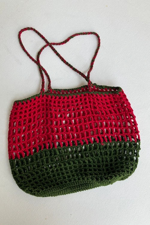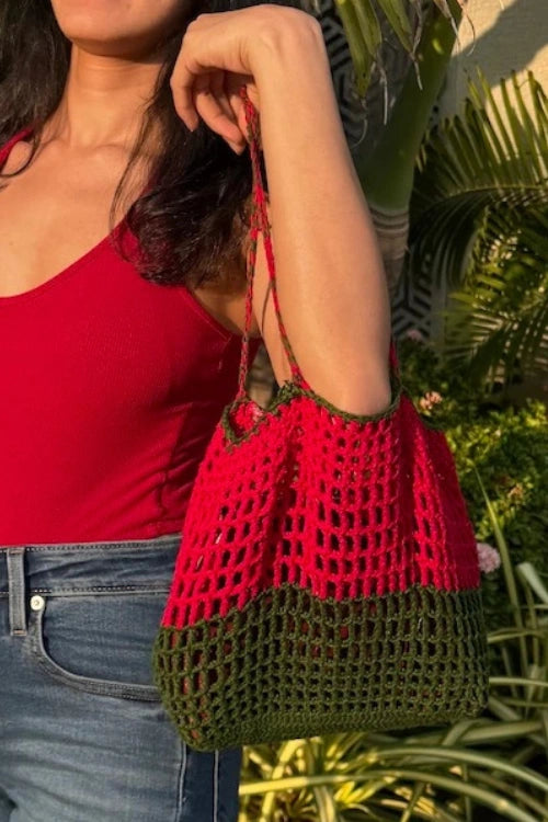 Brighten up your summer wardrobe with this eye-catching handcrafted crochet bag in bold complementary tones of cherry red and forest green. Lightweight yet sturdy, its open-weave design makes it perfect for beach days, farmer's market strolls, or casual sunny outings. The dual-color palette adds a playful pop to any outfit, effortlessly combining form and function.