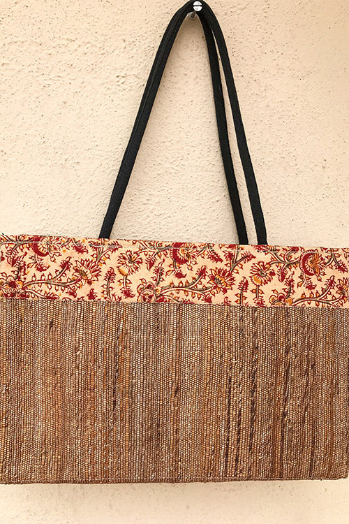 Crafted out of banana fibre with the intrinsically skillful techniques by the Women Artisans of KARNATAKA. Best quality Cotton Handles for long life. Ethnic look & Elegant feel. Can be regularly used for all occasions. Suggested to keep in dry space. Requires Least or No maintenance Ecofriendly and Bio Degradable Products may vary w.r.t. colour, texture,size etc since it is hand made & Natural. Size : 16 X 11 X 5 Inches Brown banana , Viola Body, Rust Kalmakari panel, Black handle.