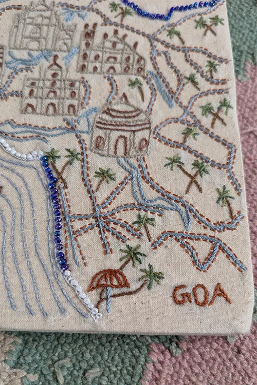 This diary, as part of our Map Diaries series, features exquisite hand embroidery and beadwork on soft off-white cotton canvas. The front cover showcases intricate stitches, including running, stem, laisy daisy, and French knot, all adding a rich, tactile dimension to the design. Each diary is stamped with a “Made by Happy Hands” message inside, a tribute to the artisans who bring it to life. The Okhai logo is elegantly placed on the back hardbound, ensuring durability. A perfect blend of artistry and function, this diary is ideal for capturing thoughts, dreams, or travel memories.