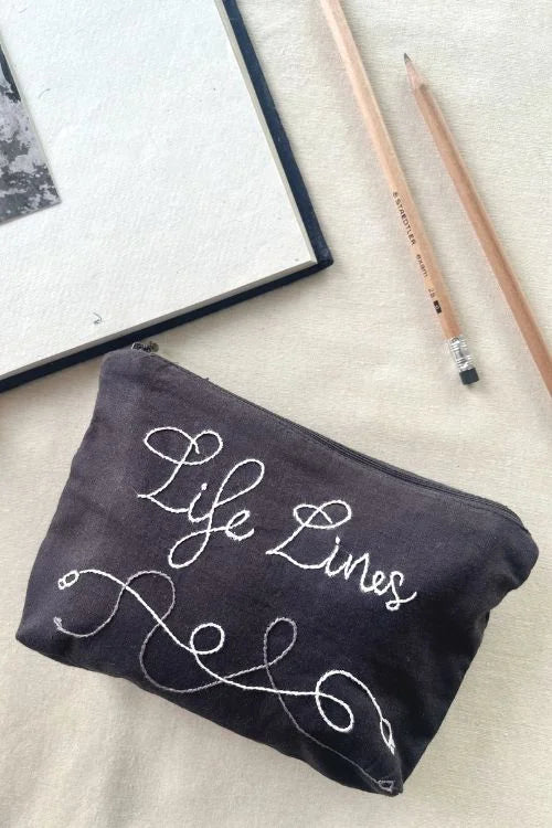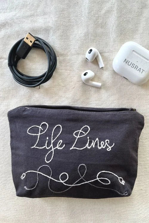 We have got a storage solution for all your handy chargers and wires- our "Life Lines" pouch! Crafted from pure cotton, words have been carefully hand-embroidered onto the front of this Charcoal Black coloured pouch. It comes quilted on the inner surface so it is durable and comes with a zipper. So go ahead, experience maximum convenience and elevate your organization game!