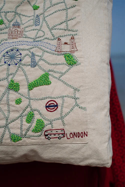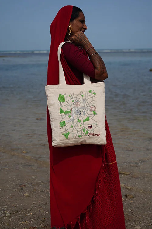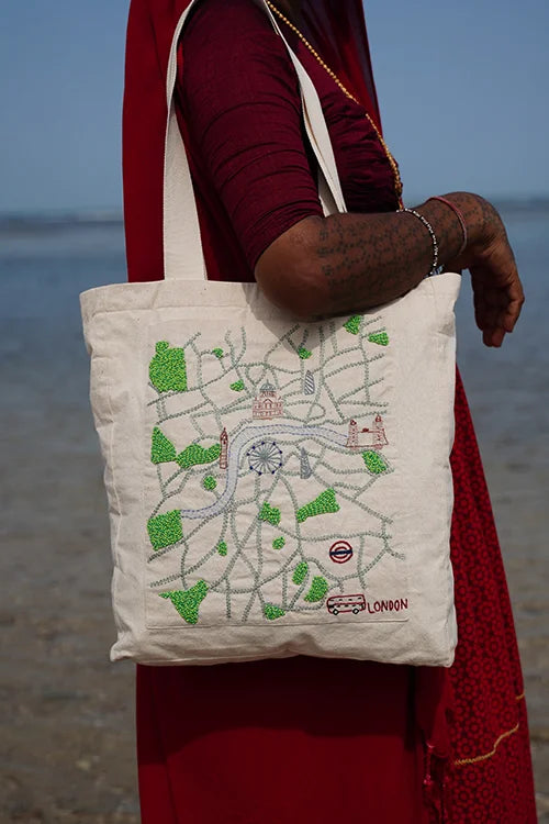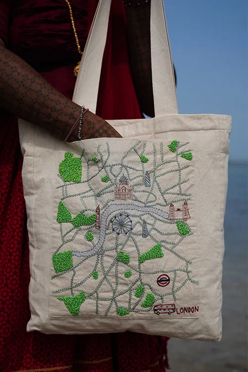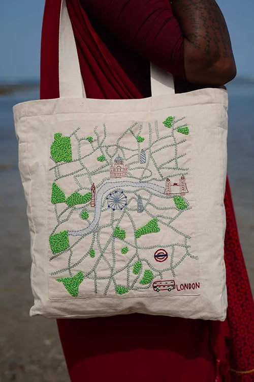 Step into London with every step you take, carrying this intricately hand-embroidered tote. Crafted from pure cotton, its body features a beautifully recreated map of the city, with the iconic Thames winding through and a single charming red double-decker bus—all brought to life by our artisans' skilled handiwork. A convenient pocket ensures it’s as practical as it is stylish, making it the ideal on-the-go companion. Its neutral tones blend seamlessly with any outfit, offering timeless versatility. And as you admire the detailed craftsmanship, here's a fun challenge: can you spot Big Ben?