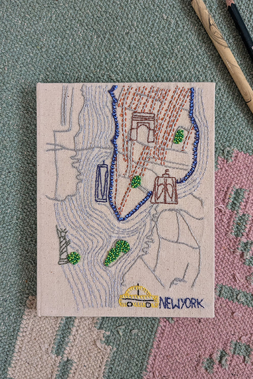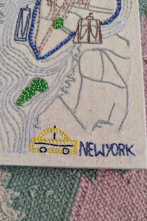 Okhai "Skyline Dreams" Hand Embroidery and Beadwork Off-White Diary captures the spirit of the city that never sleeps. On soft cotton canvas, intricate beadwork and hand embroidery, featuring running, stem, laisy daisy, and French knot stitches, create a tactile masterpiece. A "Made by Happy Hands" message adds a personal touch, while the Okhai logo on the back hardbound brings a stamp of authenticity. Perfect for capturing your urban inspirations or jotting down dreams, this diary combines artistry and function in a beautifully crafted, durable design.