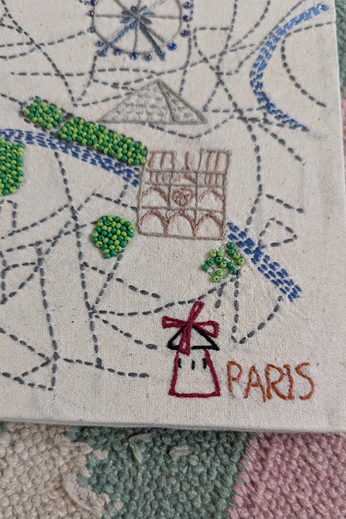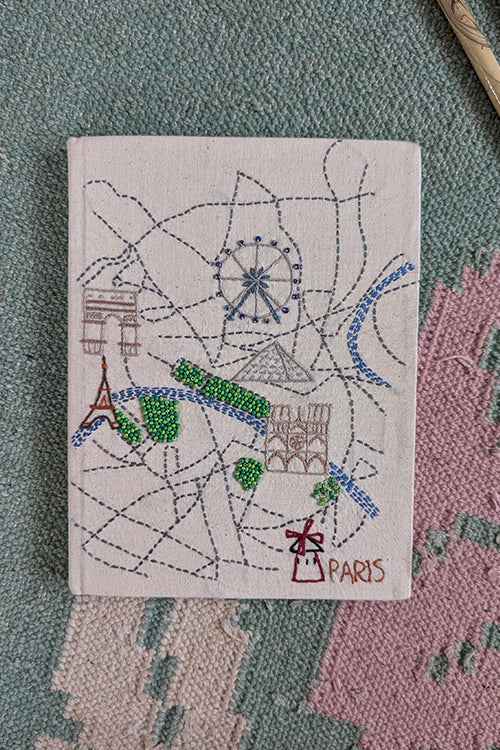 Embark on a journey with this diary, part of our Map Diaries series! Featuring stunning hand embroidery and beadwork on soft off-white cotton canvas, each diary is a work of art. Intricate stitches like running, stem, laisy daisy, and French knot adorn the front cover, adding texture and charm. Inside, you'll find a "Made by Happy Hands" message, celebrating the skilled artisans behind the craft. With the Okhai logo on the back hardbound, this diary is as durable as it is beautiful—perfect for capturing your adventures, ideas, or daydreams.