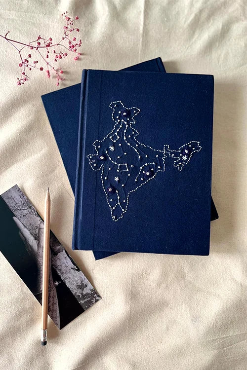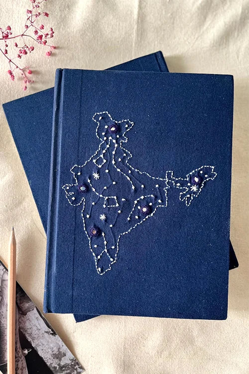 A diary is one of our favourite things, we're sure it comes in very handy for you too, right? A diary just makes our lives so much easier, be it for journaling our thoughts, emotions, experiences, and poems; and even recording our daily personal accounts, writing letters, making notes, deciding daily menus, noting things to do on a regular basis to keep ourselves organized and going. Our Okhai 'United' Hand-Emroidered Diary has an interesting and dreamy map of India, hand-crafted by artisans, on the diary's hard cover; and each diary has 60 pages, sizing 8 inches x 6 inches. These diaries also make you environmentally conscious and responsible as each page of this diary is recycled cotton waste.