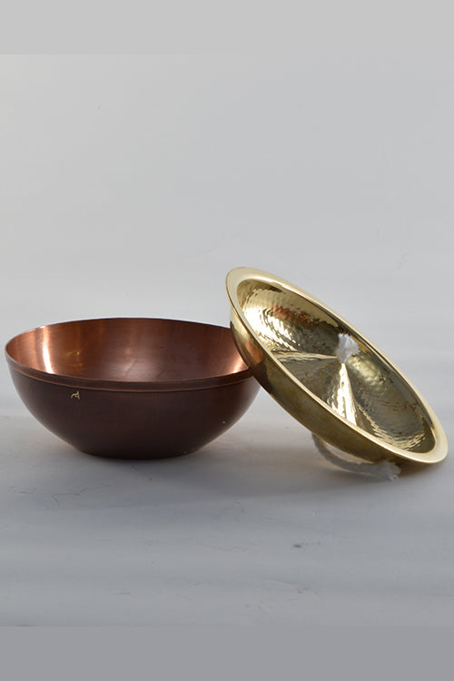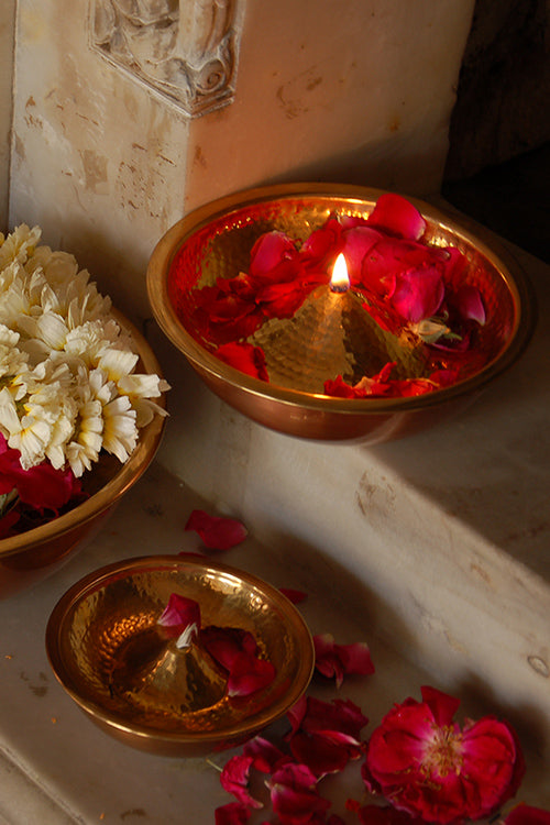 """Lau, (the flame), a double walled oil lamp made in copper and brass by the Thathera artisans of Jaipur, is an exquisite utilitarian object. Designed by Ayush Kasliwal, the first version of this lamp is gilded with gold and silver leaf. This version of the Lau Diya is simplified with the top detachable. Lau Diya has been awarded with the UNESCO Seal of Excellence for its’ innovative sustainable design. Available in three sizes, it is to be lit using liquid paraffin lamp oil only such as Amaya Luminessences. Before lighting, ensure that the wick is trimmed and not more than 1 mm above the wickholder. It is natural for the products to have subtle variations from piece to piece. Due to the nature of the materials used, there may be some tarnishing or aging of the material. This is a natural process and may require you to clean or polish the material.""