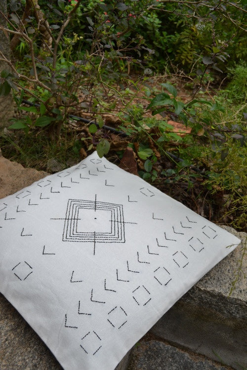 This cushion cover is part of the collection of 4 different cushion covers called 'Night and Day'. It is white in colour and has hand embroidered geometric symbols in black thread. It is made from 100% cotton and is 40x40 cm (16√ó16 inches) in size. It will look great in groups of single design as well a collection of four designs together.