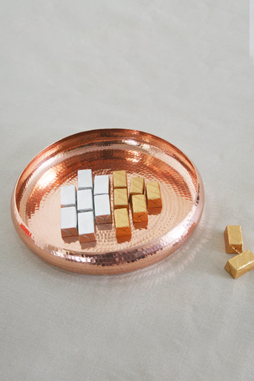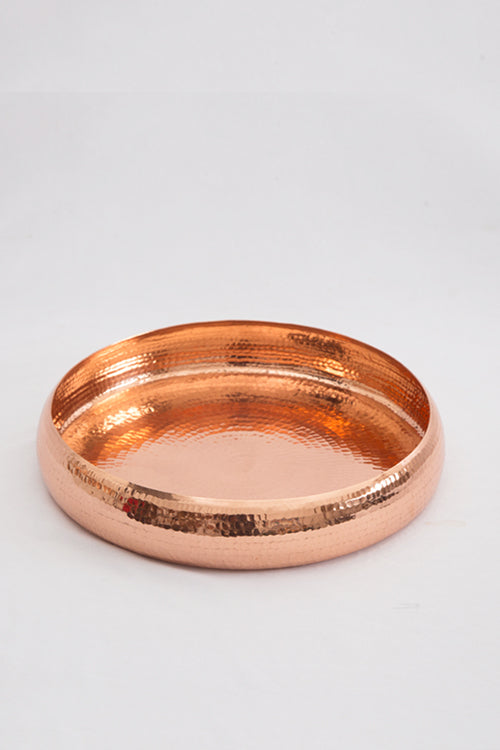 A versatile handcrafted piece, this copper urli/floater can be used in multiple ways. The color of copper and the fine etches are a treat. The design has been inspired from a hand-me-down, heirloom urli. Line it with a banana leaf or butter paper to serve some dry munches, cakes, cookies and more. You could also decorate your home by floating candles and flowers in it. Size: 10" dia x 1.75" ht