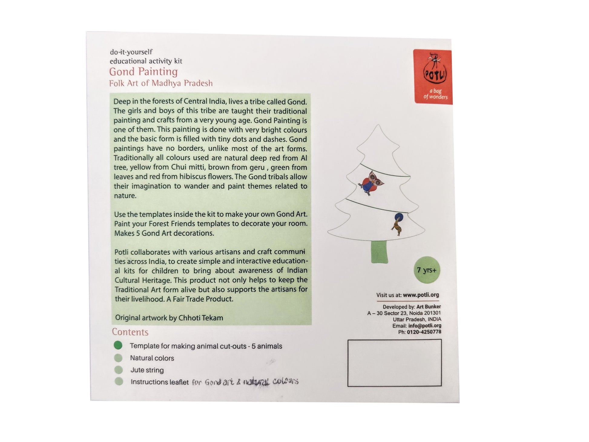 PERFECT CHRISTMAS GIFT FOR KIDS AGED 6 AND UP When kids get to make Christmas Tree Hangings and decorate themselves using all Natural and bio degradable materials, they feel like responsible grown ups ! Our FOREST FRIENDS paper hangings come all the way from the Forests of Madhya Pradesh!Made in collaboration with Gond artist, Chotti Tekam from Madhya Pradesh. Profits shared with the artist.Craft type - Gond Art. Gond Art is a form of folk art from Madhya Pradesh, practised by a tribe called Gond.Material : No plastic . 100% natural. Package Inclusions - Natural colours - 3, String , Templates for colouring , Instructions and information leaflet for Gond Art and Natural Colours.Potli is a member of FAIR TRADE FORUM-India. We follow all FAIR TRADE practices laid down by the Forum. EXCEPTIONAL DEVELOPMENTAL KIT This Kit encourages non-digital and tactile play . We stimulate creative thinking and imaginative play while sharing the rich cultural heritage of India.