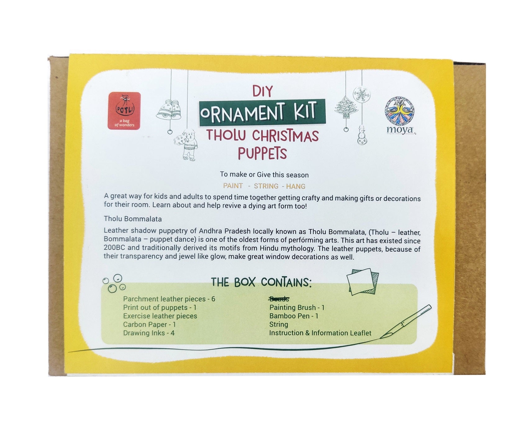 PERFECT CHRISTMAS GIFT FOR for AGE 8-80 years. Spend some family time together with our Tholu Ornament Kit ! Make your own christmas decorations and learn about this art form from Andhra Pradesh. Support the artisans behind this and bring a smile on their faces ! 100% Handmade - Handmade by recognised Artisans from Andhra Pradesh.Craft type - Tholu Bommalata - Leather Shadow Puppets. Tholu Bommalata , Leather Shadow Puppets of Andhra Pradesh is a traditional craft and performing art that has existed since 200BC. Its one of theoldest forms of Performing Arts in India. Traditionally, shadow puppets of epics like Ramayan and Mahabharat are made and stories narrated.Material : No plastic . 100% natural. Package Inclusions - parchment leather pieces - 6, Printout of puppets, Extra practice leather pieces, Tracing paper, Drawing inks - 4, Painting brush-1, Bamboo pen - 1, String , Instruction leaflet. Potli is a member of FAIR TRADE FORUM-India. We follow all FAIR TRADE practices laid down by the Forum. EXCEPTIONAL DEVELOPMENTAL TOY This Kit encourages non-digital and tactile play . We stimulate creative thinking and imaginative play while sharing the rich cultural heritage of India.