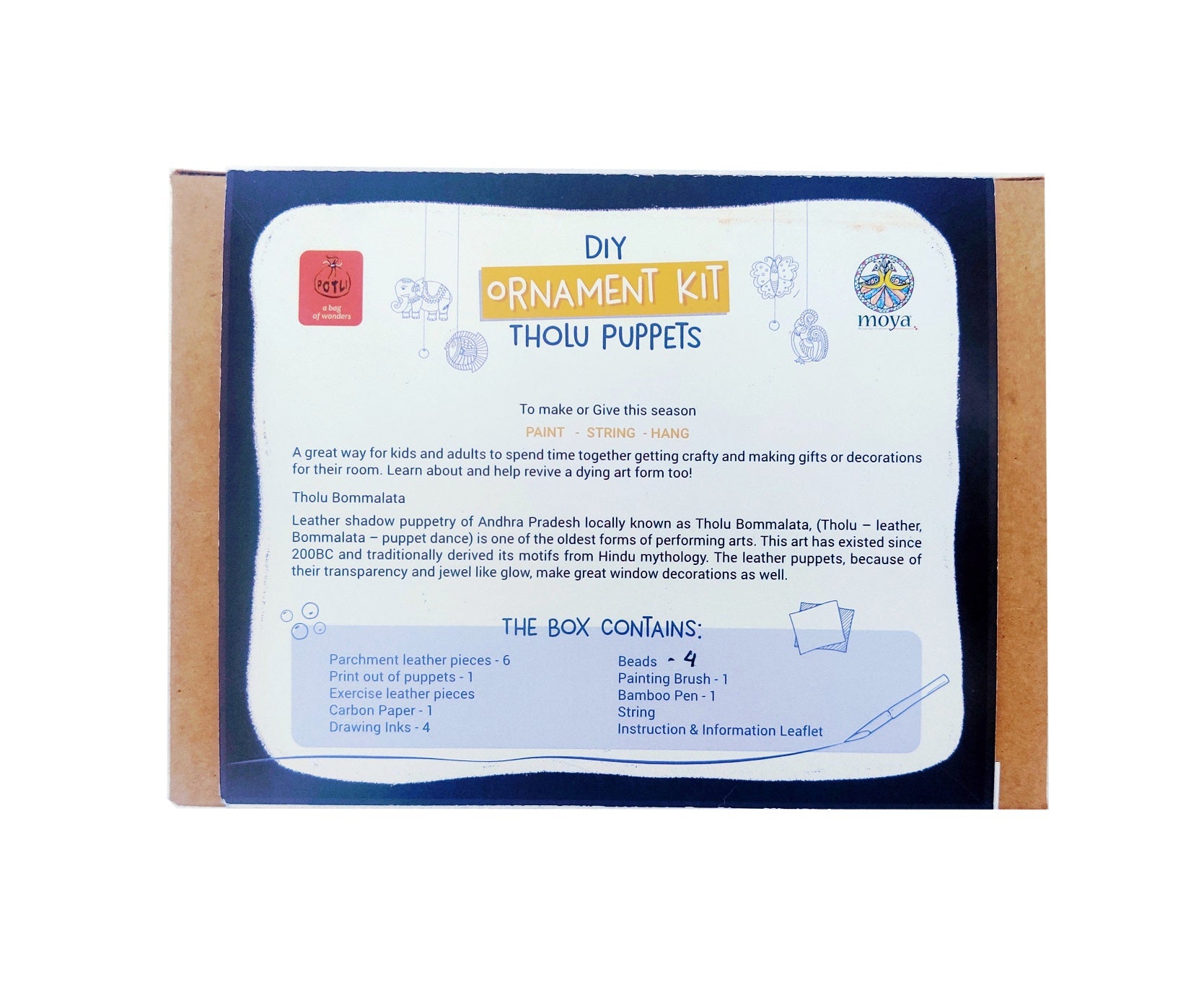PERFECT CHRISTMAS GIFT FOR for AGE 8-80 years. Spend some family time together with our Tholu Ornament Kit ! Make your own christmas decorations and learn about this art form from Andhra Pradesh. Support the artisans behind this and bring a smile on their faces ! 100% Handmade - Handmade by recognised Artisans from Andhra Pradesh.Tholu Bommalata , Leather Shadow Puppets of Andhra Pradesh is a traditional craft and performing art that has existed since 200BC. Its one of theoldest forms of Performing Arts in India. Traditionally, shadow puppets of epics like Ramayan and Mahabharat are made and stories narrated.Material : No plastic . 100% natural. Package Inclusions - parchment leather pieces - 6, Printout of puppets, Extra practice leather pieces, Tracing paper, Drawing inks - 4, Chinnapatna beads-4, Painting brush-1, Bamboo pen - 1, String , Instruction leaflet.Potli is a member of FAIR TRADE FORUM-India. We follow all FAIR TRADE practices laid down by the Forum. EXCEPTIONAL DEVELOPMENTAL TOY This Kit encourages non-digital and tactile play . We stimulate creative thinking and imaginative play while sharing the rich cultural heritage of India.