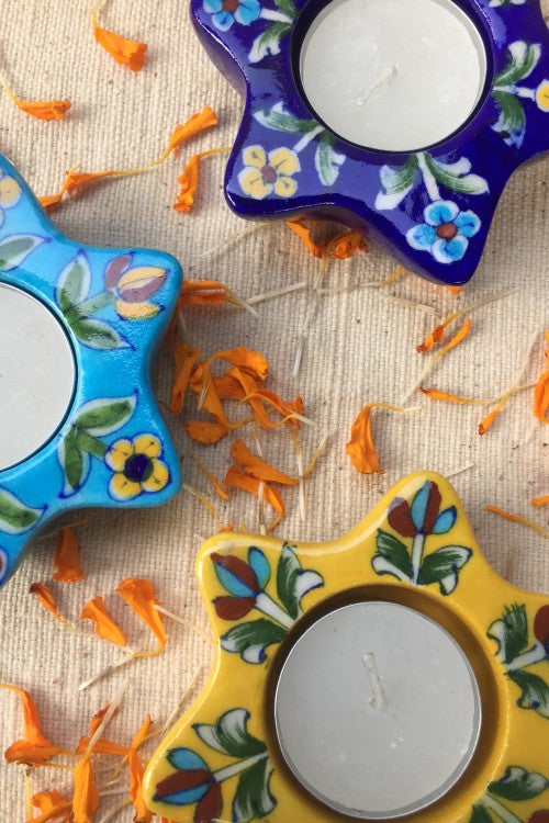 Ram Gopal Blue Pottery Handcrafted 'Orchid Diya T-Candles ' Blue Green Yellow